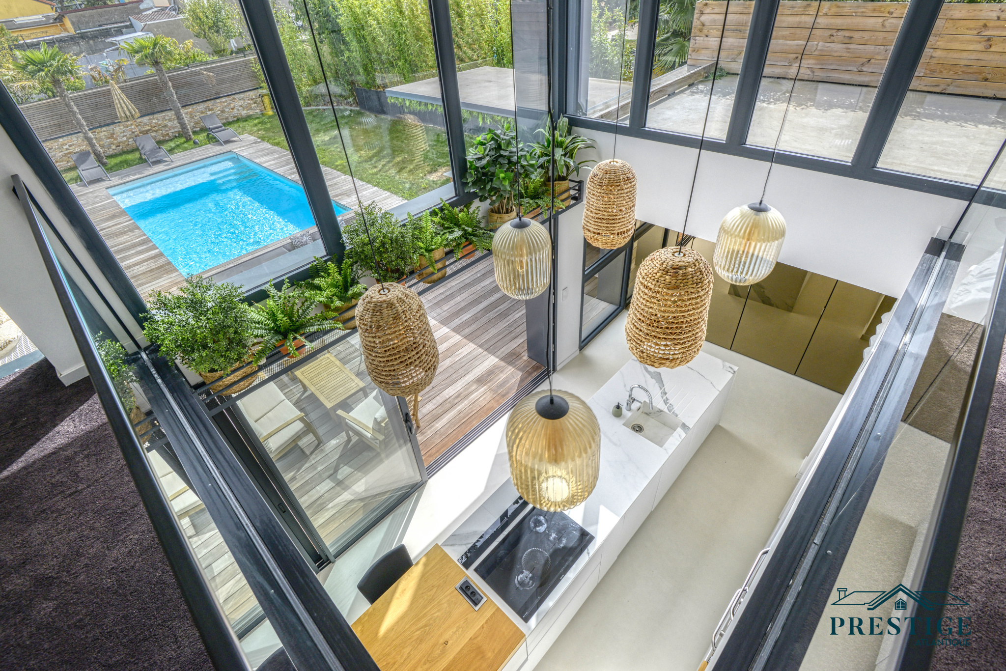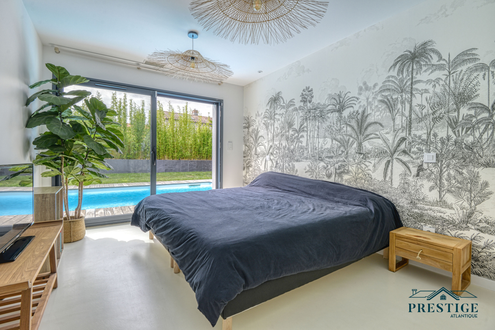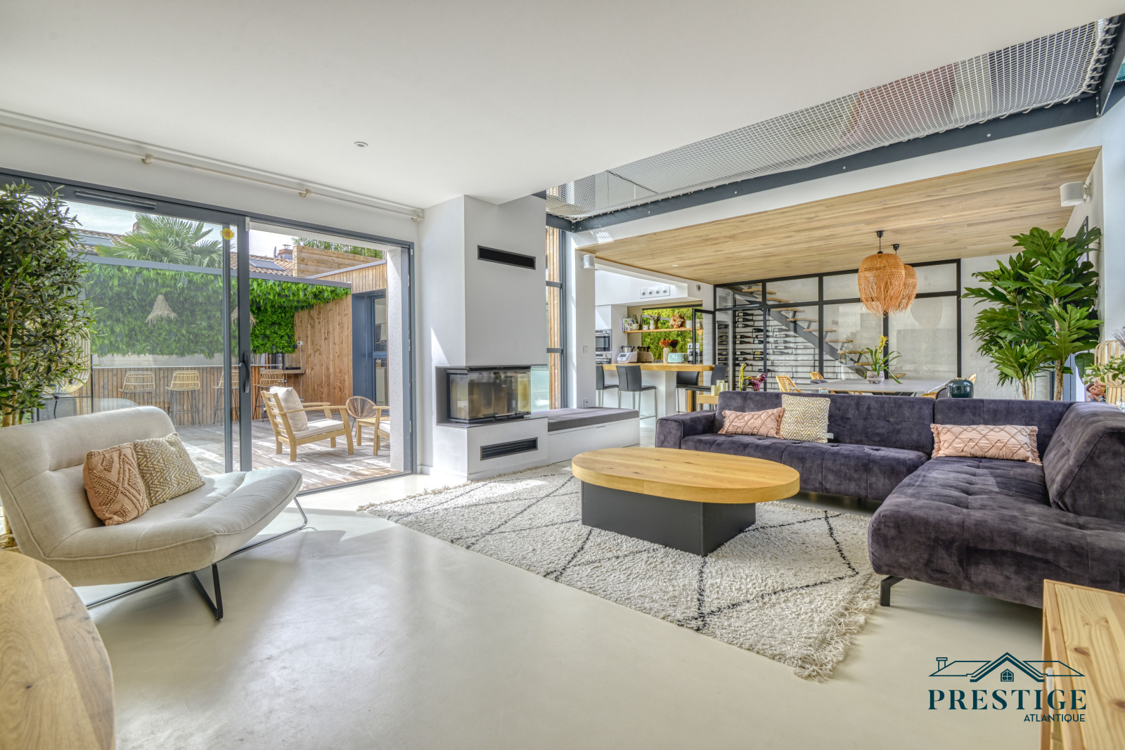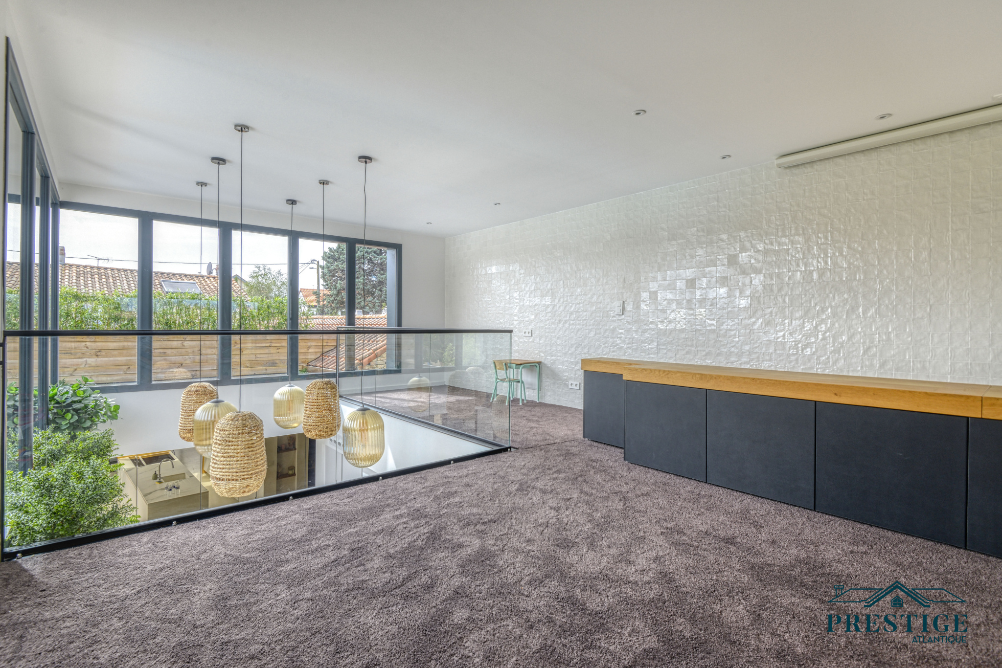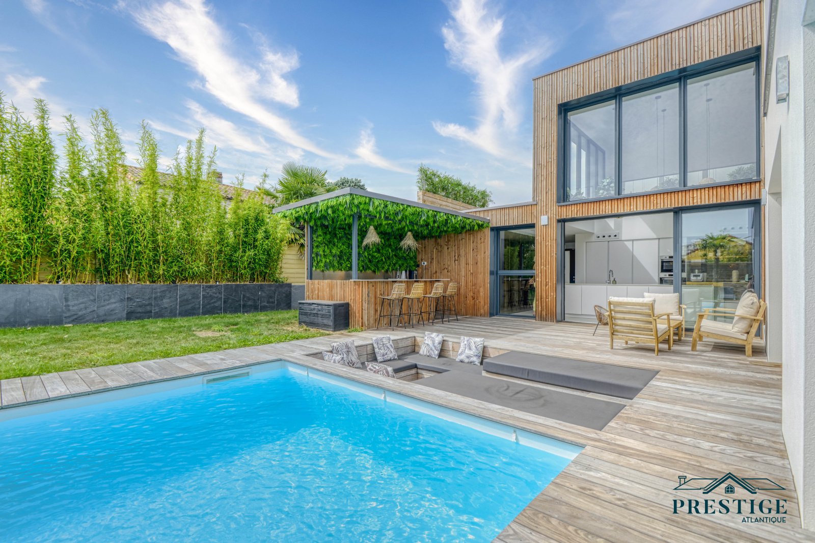 VENDU PAR PRESTIGE ATLANTIQUE. Au Sud de Nantes dans un quartier calme, cette splendide maison d’architecte en second rideau agencée avec goût sur deux niveaux dispose d'une superficie habitable de 176 m2. Un hall d'entrée avec placards dessert une cuisine Premium ouverte aménagée et équipée, prolongée d’une spacieuse pièce de vie agrémentée de sa cheminée et de sa cave à vin design. L’ensemble est doté d’une belle hauteur sous plafond et de deux terrasses à la vue imprenable sur sa piscine de par ses larges baies vitrées effaçant ainsi les frontières entre l'intérieur et l'extérieur venant offrir une qualité de vie des plus idéale. L’espace nuit bénéficie d’une Master Bedroom avec dressing et salle de bain privatifs en accès direct à la terrasse, de deux chambres et d’une salle d’eau. Une buanderie complète cette vie de plain-pied. Au niveau supérieur, une vaste mezzanine ainsi q’un filet marin suspendu surplombant l’espace de vie viennent parfaire les prestations haut-de-gamme de ce joli bien baignant de lumière. Edifiée sur une parcelle close et intimiste de 682 m2, un garage double et un local technique attenants ainsi qu’une piscine et son Pool House mettent un point final à cette maison contemporaine. Le moderne et le haut de gamme reflètent ce bien unique aux nombreux atouts. “Les informations sur les risques auxquels ce bien est exposé sont disponibles sur le site Géorisques http://www.georisques.gouv.fr”. Pour plus de renseignements ou pour organiser une visite privée, contactez-nous sans plus attendre, PRESTIGE ATLANTIQUE 02.40.21.91.13. Prix de vente 756 000€ FAI dont 5% d'honoraires agence à la charge de l'acquéreur soit un prix net vendeur de 720 000€ (RCS. Saint- Nazaire 897 587 946).