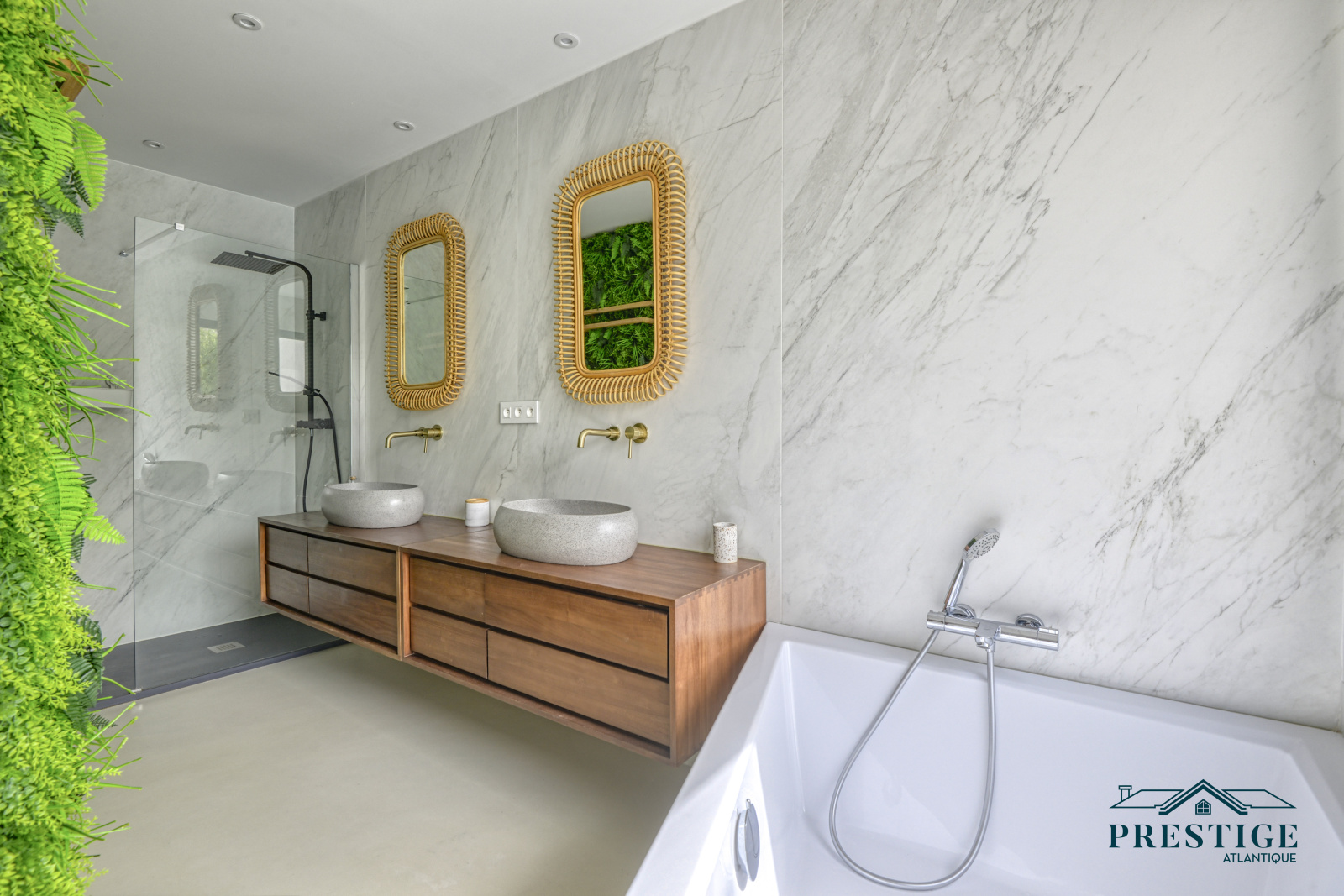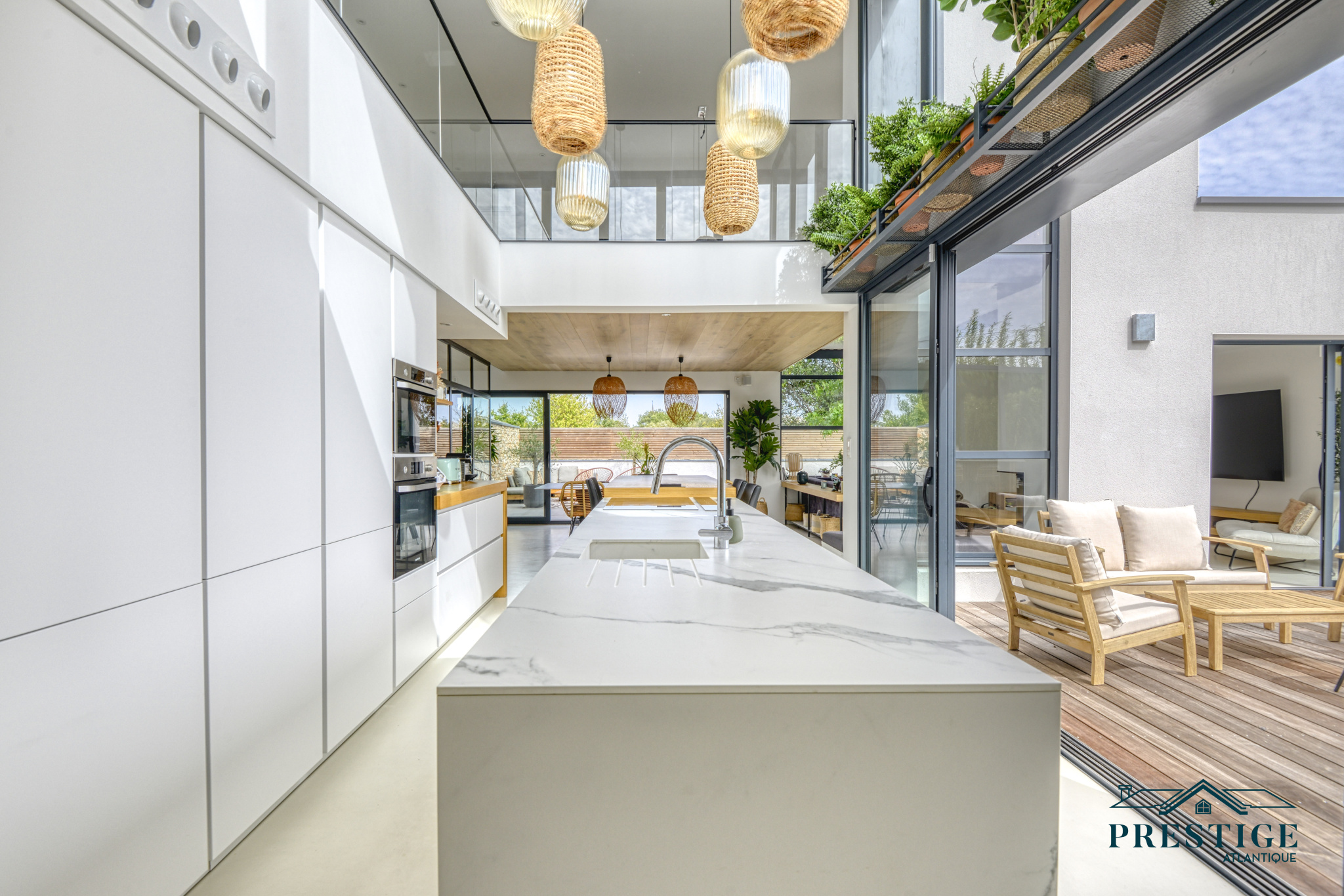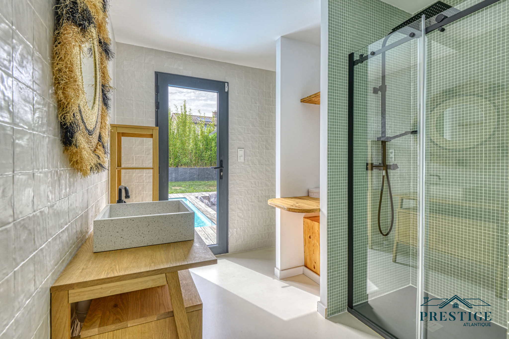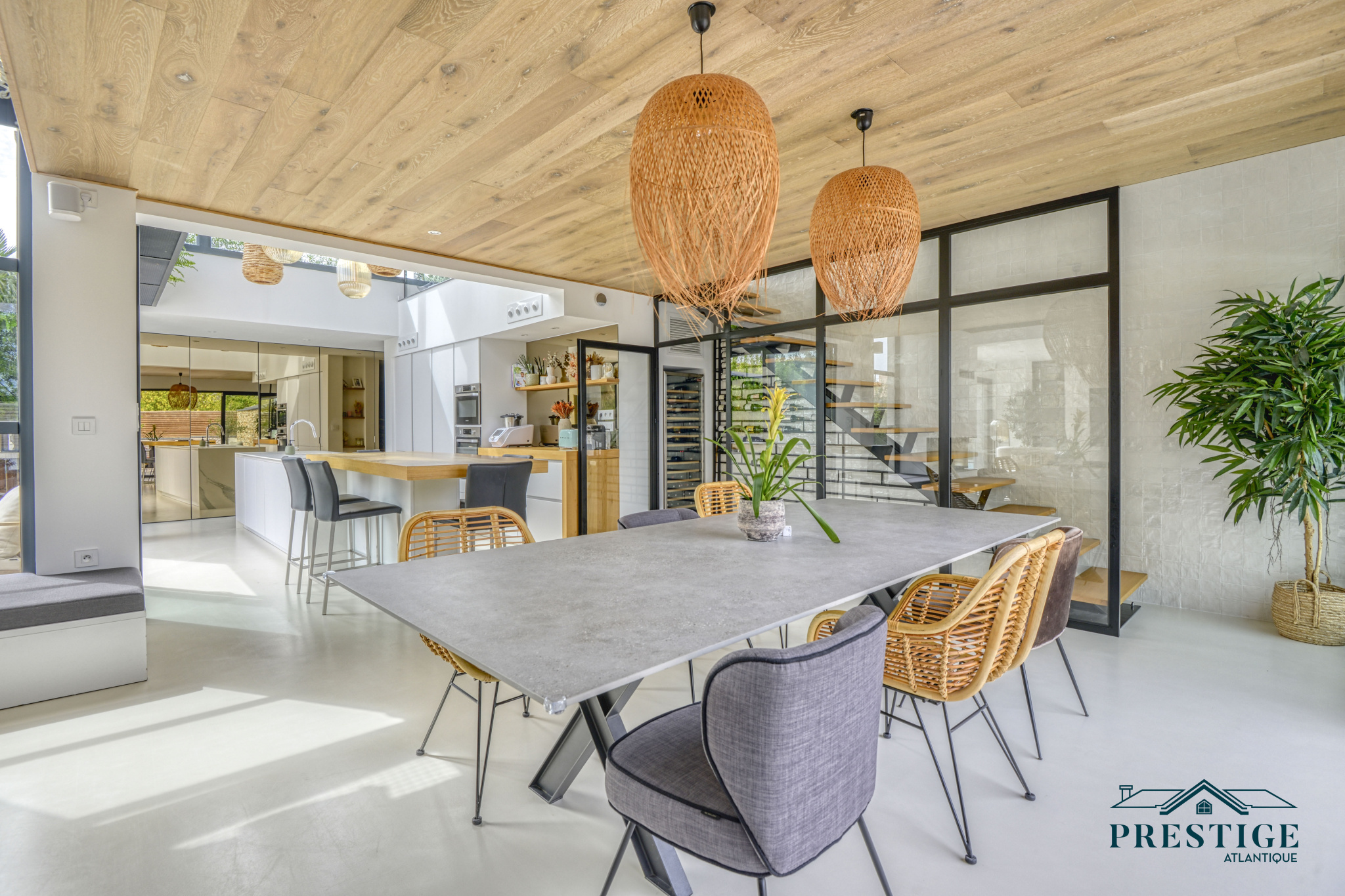 VENDU PAR PRESTIGE ATLANTIQUE. Au Sud de Nantes dans un quartier calme, cette splendide maison d’architecte en second rideau agencée avec goût sur deux niveaux dispose d'une superficie habitable de 176 m2. Un hall d'entrée avec placards dessert une cuisine Premium ouverte aménagée et équipée, prolongée d’une spacieuse pièce de vie agrémentée de sa cheminée et de sa cave à vin design. L’ensemble est doté d’une belle hauteur sous plafond et de deux terrasses à la vue imprenable sur sa piscine de par ses larges baies vitrées effaçant ainsi les frontières entre l'intérieur et l'extérieur venant offrir une qualité de vie des plus idéale. L’espace nuit bénéficie d’une Master Bedroom avec dressing et salle de bain privatifs en accès direct à la terrasse, de deux chambres et d’une salle d’eau. Une buanderie complète cette vie de plain-pied. Au niveau supérieur, une vaste mezzanine ainsi q’un filet marin suspendu surplombant l’espace de vie viennent parfaire les prestations haut-de-gamme de ce joli bien baignant de lumière. Edifiée sur une parcelle close et intimiste de 682 m2, un garage double et un local technique attenants ainsi qu’une piscine et son Pool House mettent un point final à cette maison contemporaine. Le moderne et le haut de gamme reflètent ce bien unique aux nombreux atouts. “Les informations sur les risques auxquels ce bien est exposé sont disponibles sur le site Géorisques http://www.georisques.gouv.fr”. Pour plus de renseignements ou pour organiser une visite privée, contactez-nous sans plus attendre, PRESTIGE ATLANTIQUE 02.40.21.91.13. Prix de vente 756 000€ FAI dont 5% d'honoraires agence à la charge de l'acquéreur soit un prix net vendeur de 720 000€ (RCS. Saint- Nazaire 897 587 946).