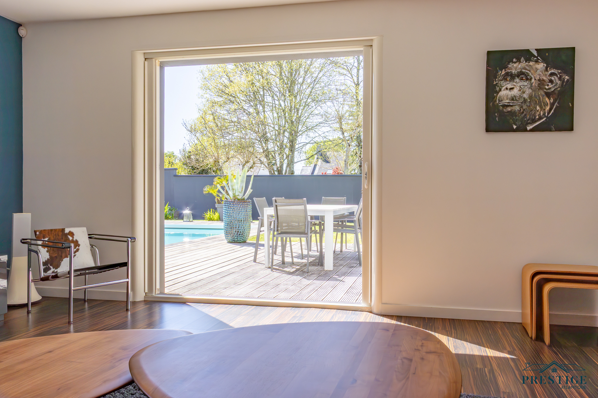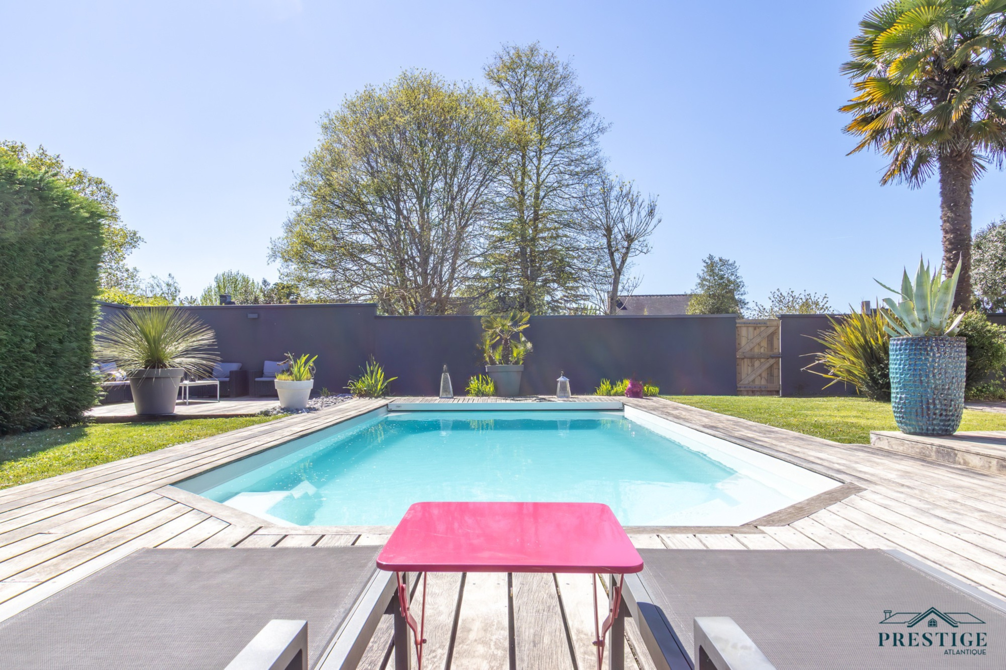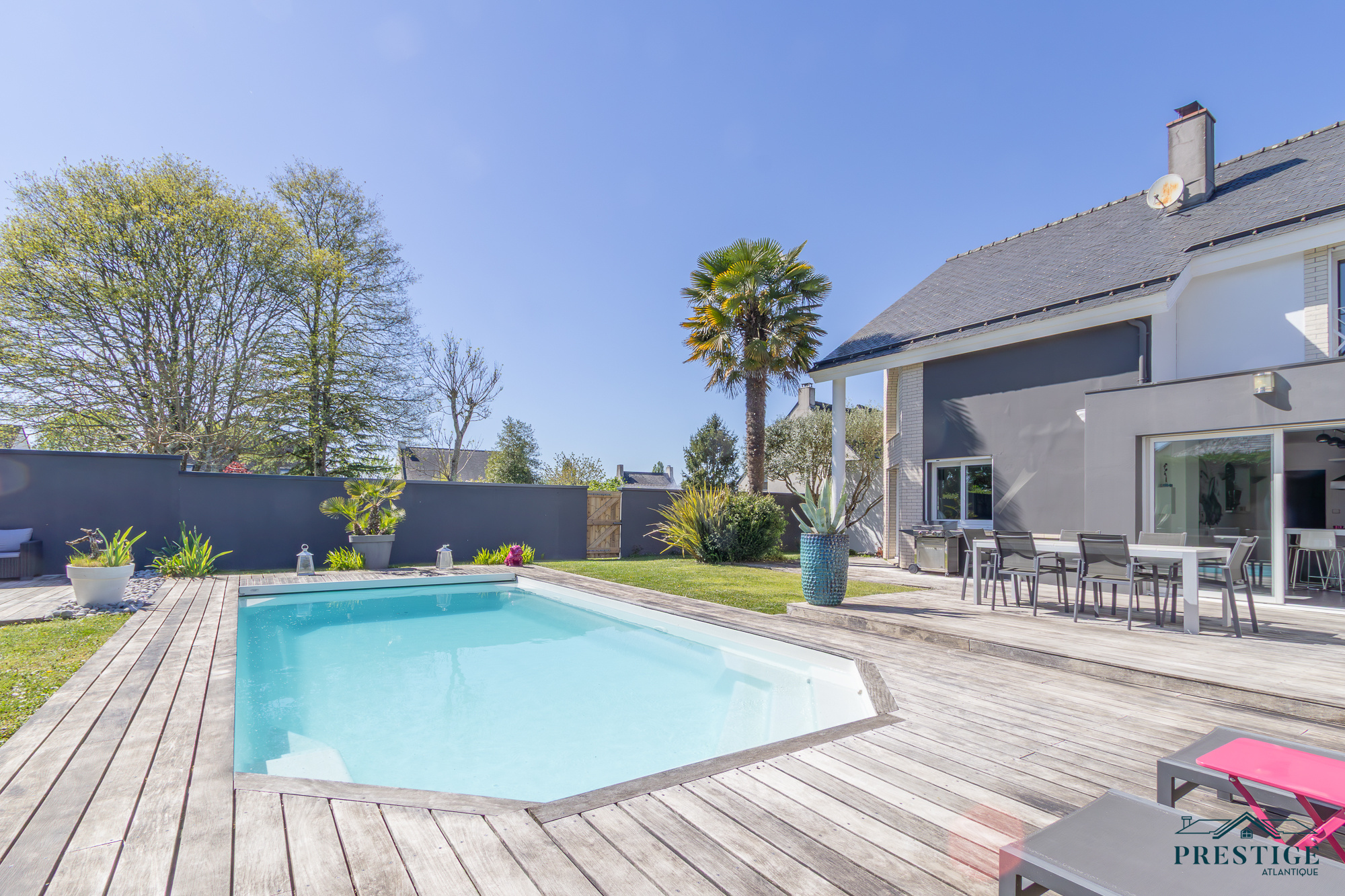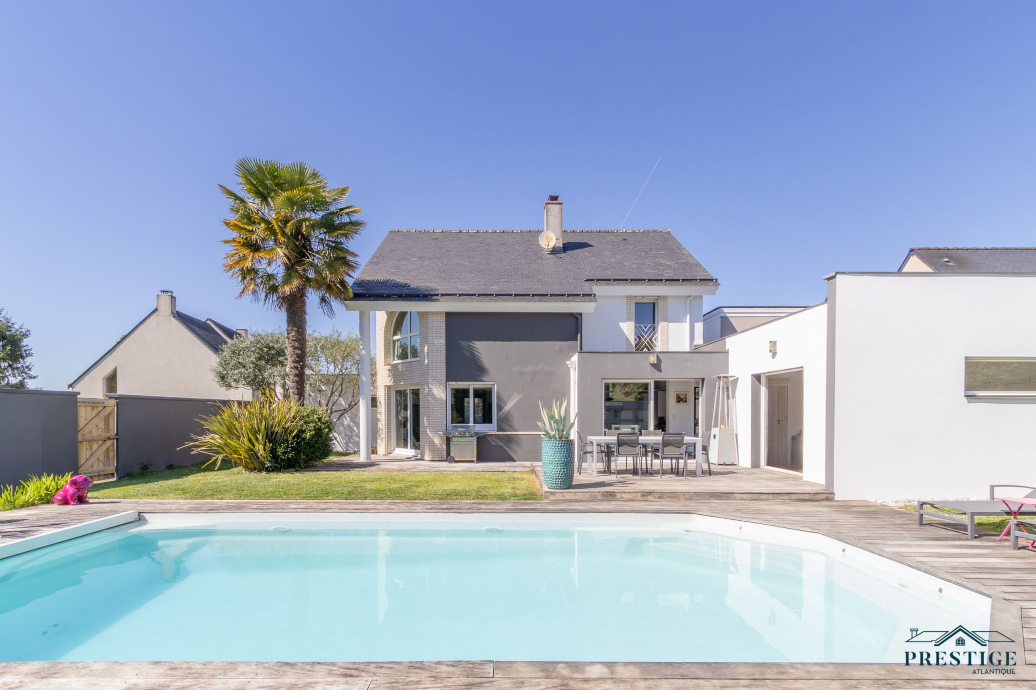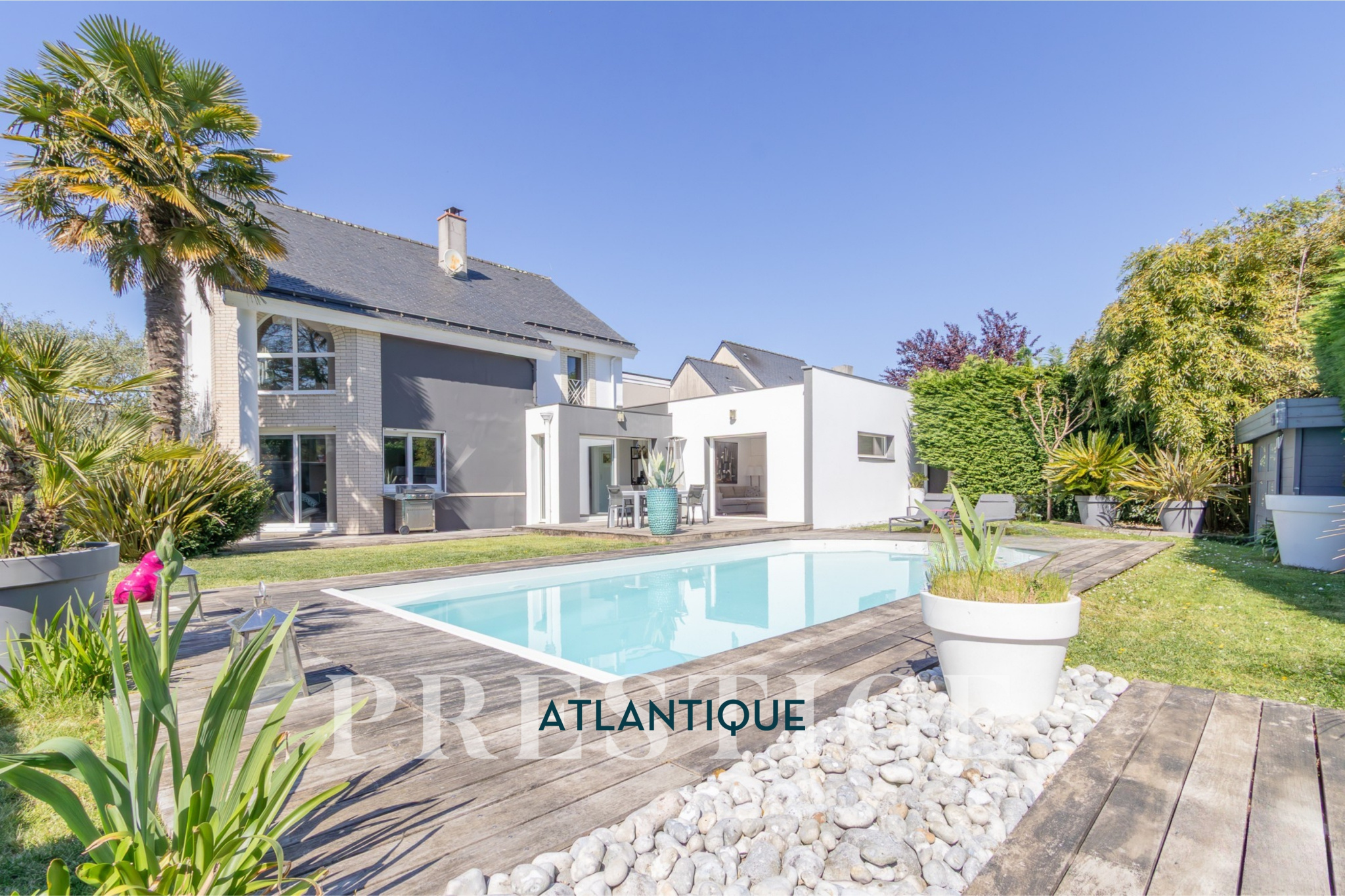 EXCLUSIVITÉ - PRESTIGE ATLANTIQUE. Aux portes de Nantes et à proximité du centre bourg de Sainte-Luce sur Loire, cette maison contemporaine édifiée sur deux niveaux, aux prestations soignées et à l'agencement de qualité dispose de 201 m2 habitables. L’entrée s’ouvre sur une vaste pièce de vie lumineuse, agrémentée d’une cuisine entièrement aménagée et équipée, le tout ouvert par de larges baies vitrées donnant accès à une terrasse avec vue imprenable sur une piscine chauffée, effaçant harmonieusement les frontières entre intérieur et extérieur. Le Rez-de-chaussée offre une vraie vie de plain-pied avec un second salon ouvert sur le jardin pouvant facilement devenir une chambre ou une suite parentale selon vos besoins. Un bureau complète ce niveau. A l'étage, un palier sublimé par un plancher de verre distribue trois chambres dont une magnifique suite parentale avec dressing et salle de bains privative. Une salle d’eau vient parfaire cet espace nuit. Édifiée sur une parcelle close et joliment arborée de 650 m2, deux garages attenants dont un avec une mezzanine ainsi que deux places de stationnement donne une touche finale à l'ensemble. Ce bien allie avec élégance confort, modernité et une qualité de vie des plus idéales. Les informations sur les risques auxquels ce bien est exposé sont disponibles sur le site Géorisques http://www.georisques.gouv.fr. Prix de vente 871 500€ FAI dont 5% d'honoraires agence à la charge de l'acquéreur soit un prix net vendeur de 830 000€. Prestige Atlantique (RCS. Saint- Nazaire 897 587 946) 02 40 21 91 13.