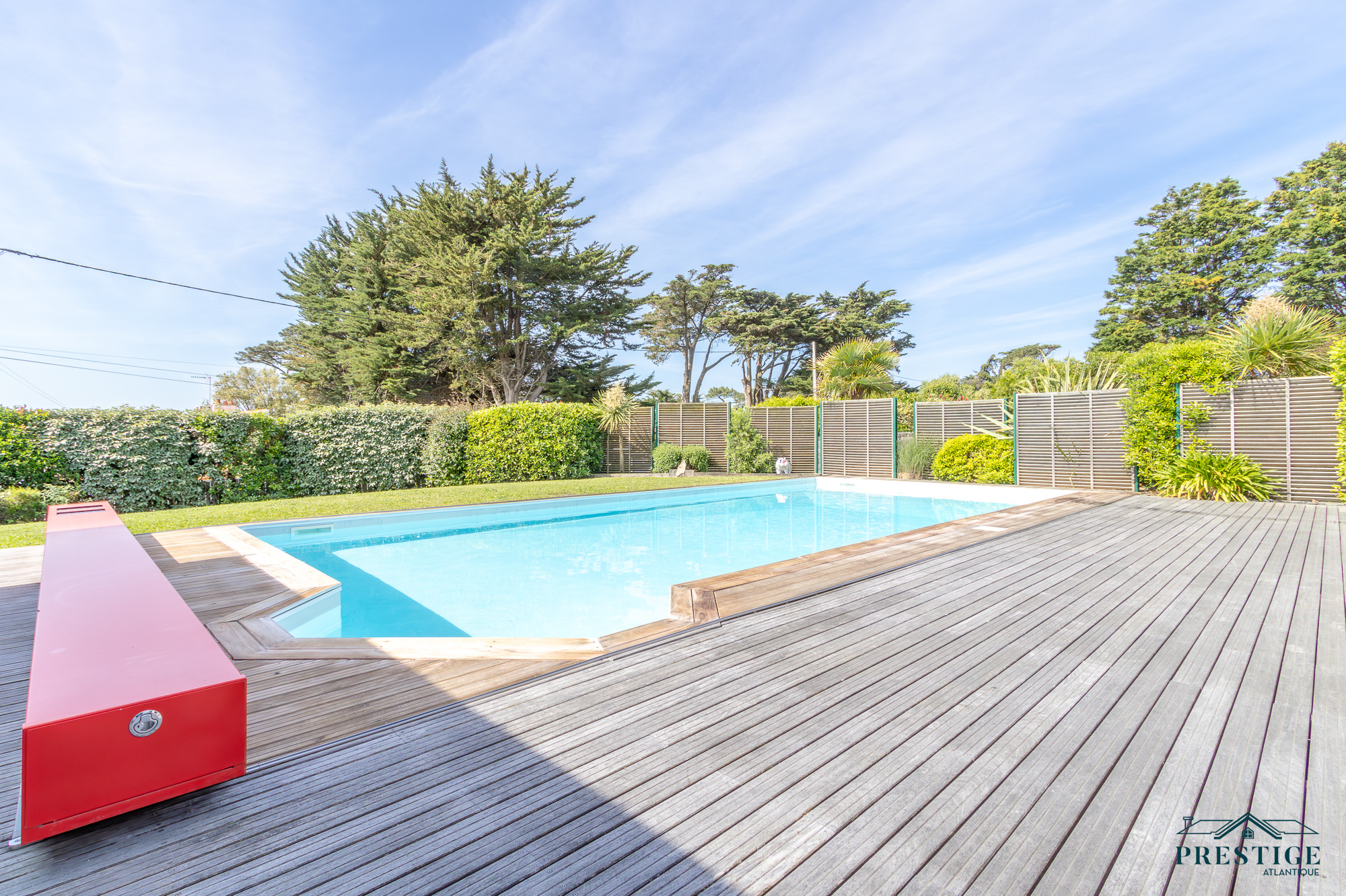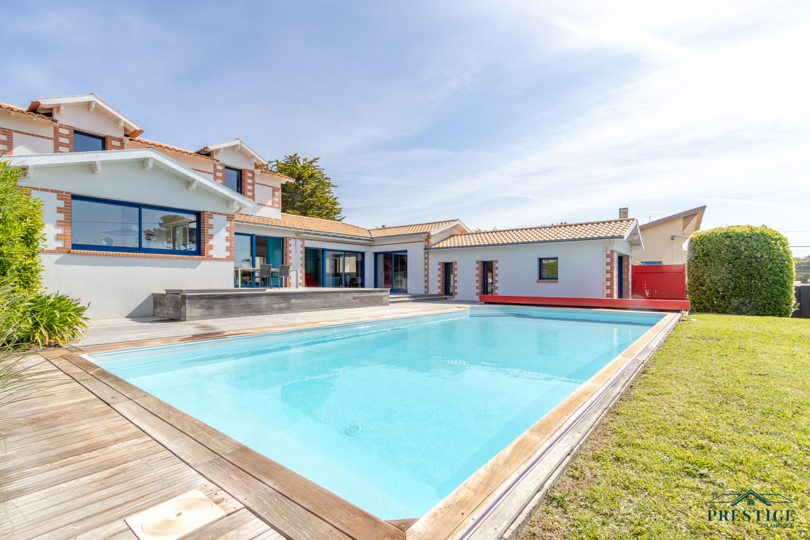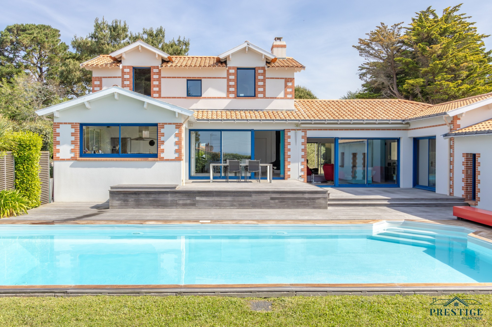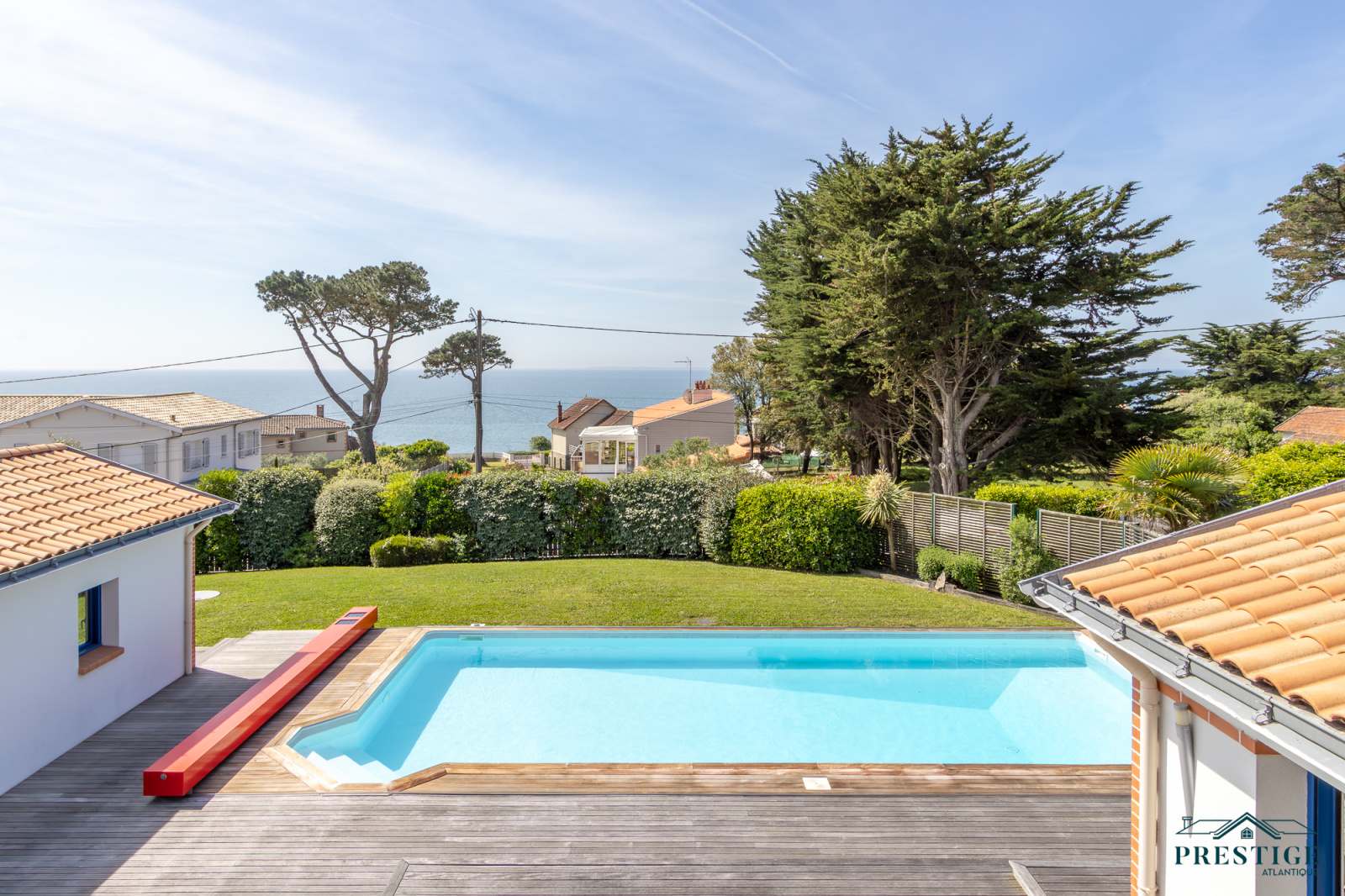VENDU PAR PRESTIGE ATLANTIQUE. RARE SUR LE MARCHÉ. Vue imprenable sur l’océan, cette villa de style contemporain, signée par l'architecte Guillaumet dispose d’une superficie habitable de 220 m². Une majestueuse porte d'entrée sur pivot ouvre sur un double espace de vie aux volumes généreux doté de grandes baies vitrées offrant une vue imprenable sur la piscine et la mer. La cuisine indépendante mais ouverte, avec son arrière cuisine conjugue fonctionnalité et convivialité, le tout en accès direct au séjour et à la terrasse. L’espace nuit de plain-pied offre une suite parentale comprenant salle de bains, dressing et bureau, ainsi qu'une seconde suite et une troisième chambre, toutes deux ouvertes sur un patio vitré baigné de lumière. À l’étage, un palier dessert deux belles chambres profitant d’une vue imprenable sur la mer, accompagnées d’une salle d’eau. Édifiée sur un terrain clos, arboré et paysager de 1316 m², un patio intimiste, un garage double, une cave et une dépendance complètent ce bien rare. Cette villa d’exception séduit par son style typique de la Côte de Jade, un parfait équilibre entre maison familiale et résidence de vacances en bord de mer. Des prestations soignées et de beaux volumes au sein d’un environnement calme et privilégié. “Les informations sur les risques auxquels ce bien est exposé sont disponibles sur le site Géorisques http://www.georisques.gouv.fr”. Pour plus de renseignements ou pour organiser une visite privée, contactez-nous sans plus attendre, PRESTIGE ATLANTIQUE 02.40.21.91.13. Prix de vente 1 596 000€ FAI dont 5 % d'honoraires agence à la charge de l'acquéreur soit un prix net vendeur de 1 520 000€ (RCS. Saint- Nazaire 897 587 946).