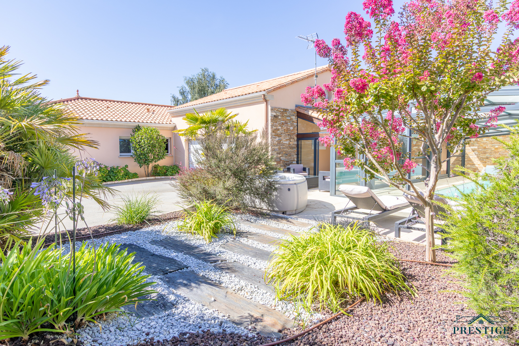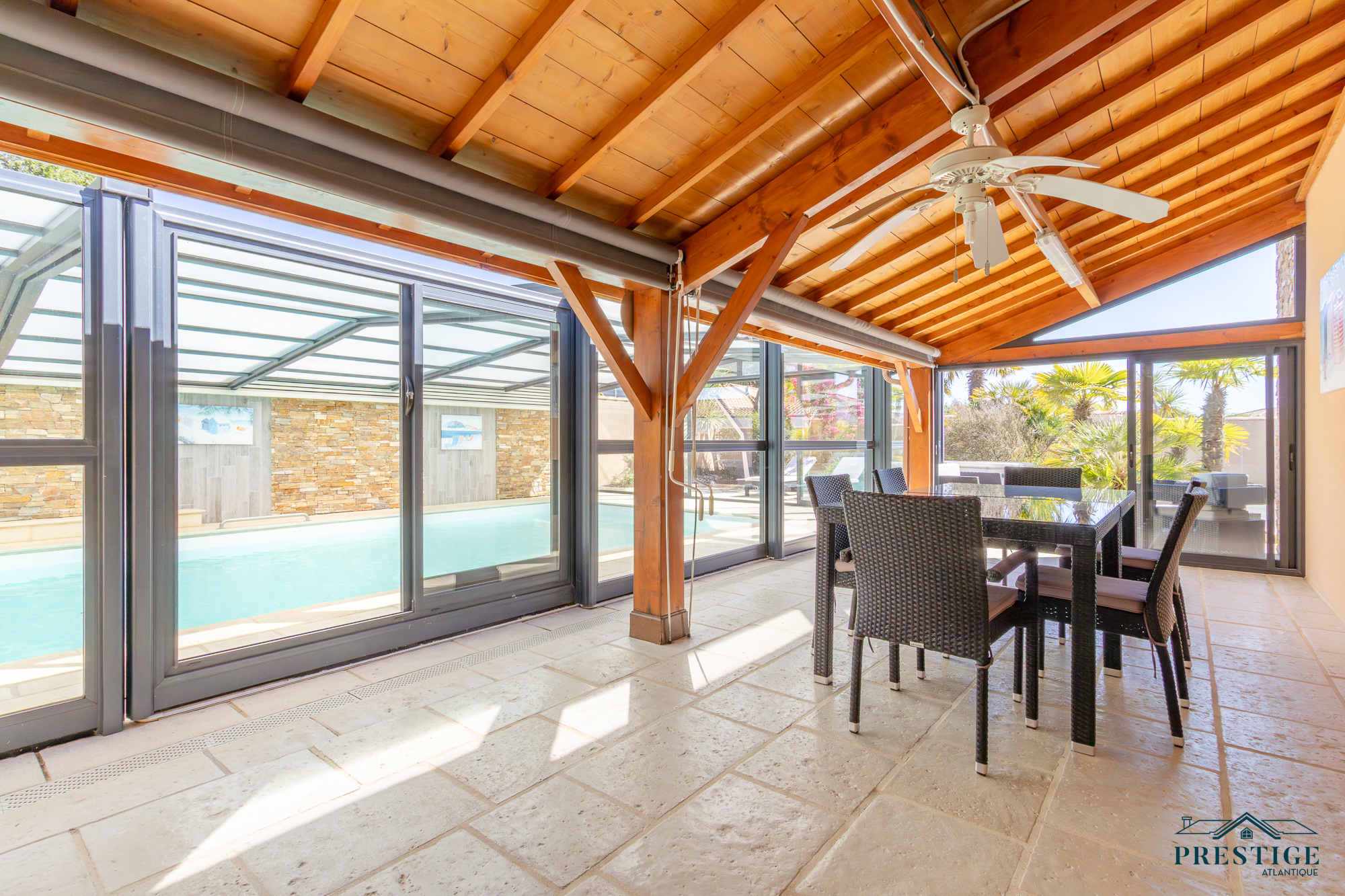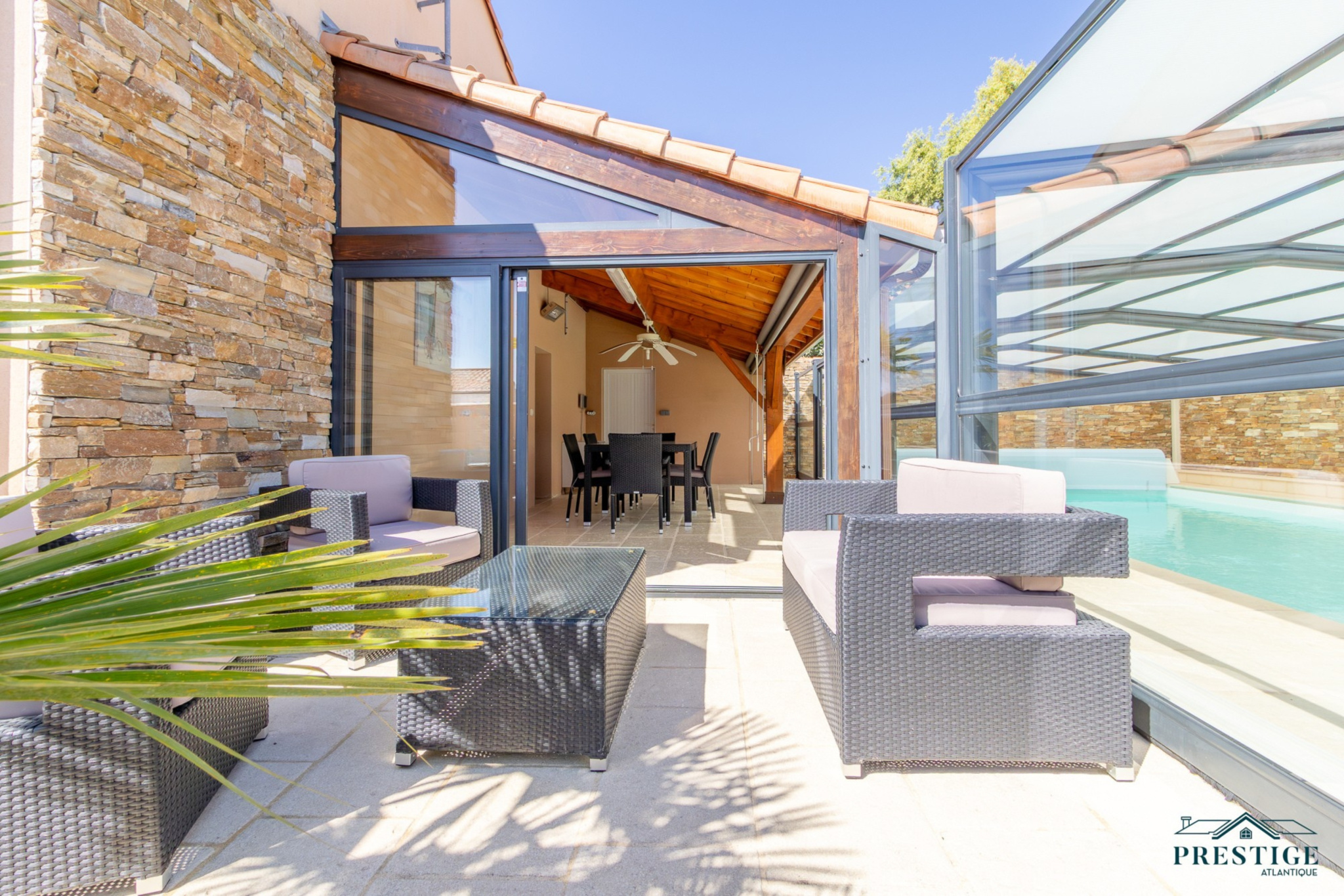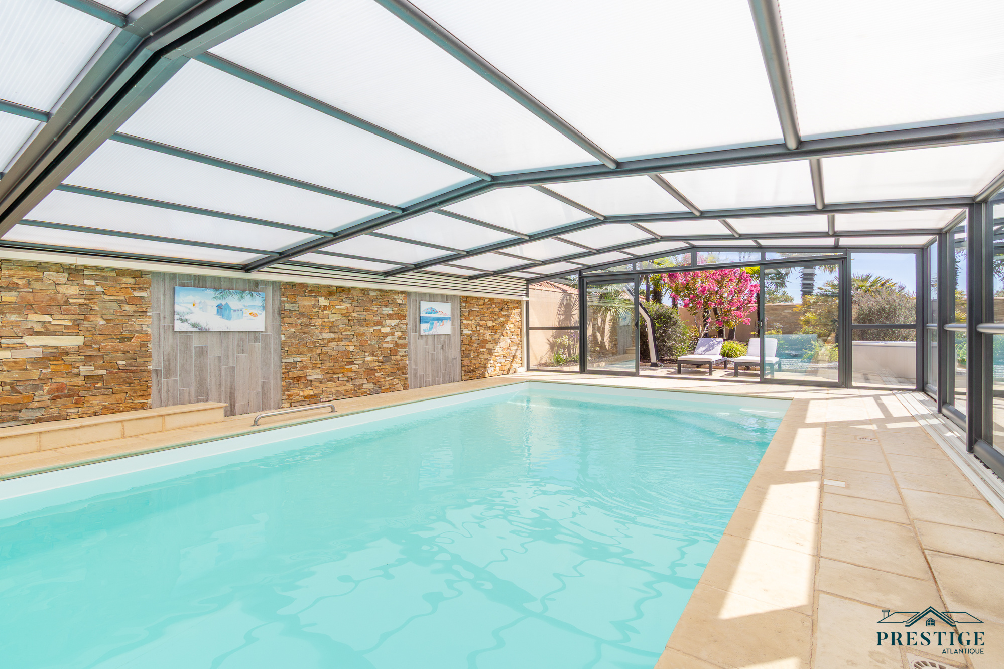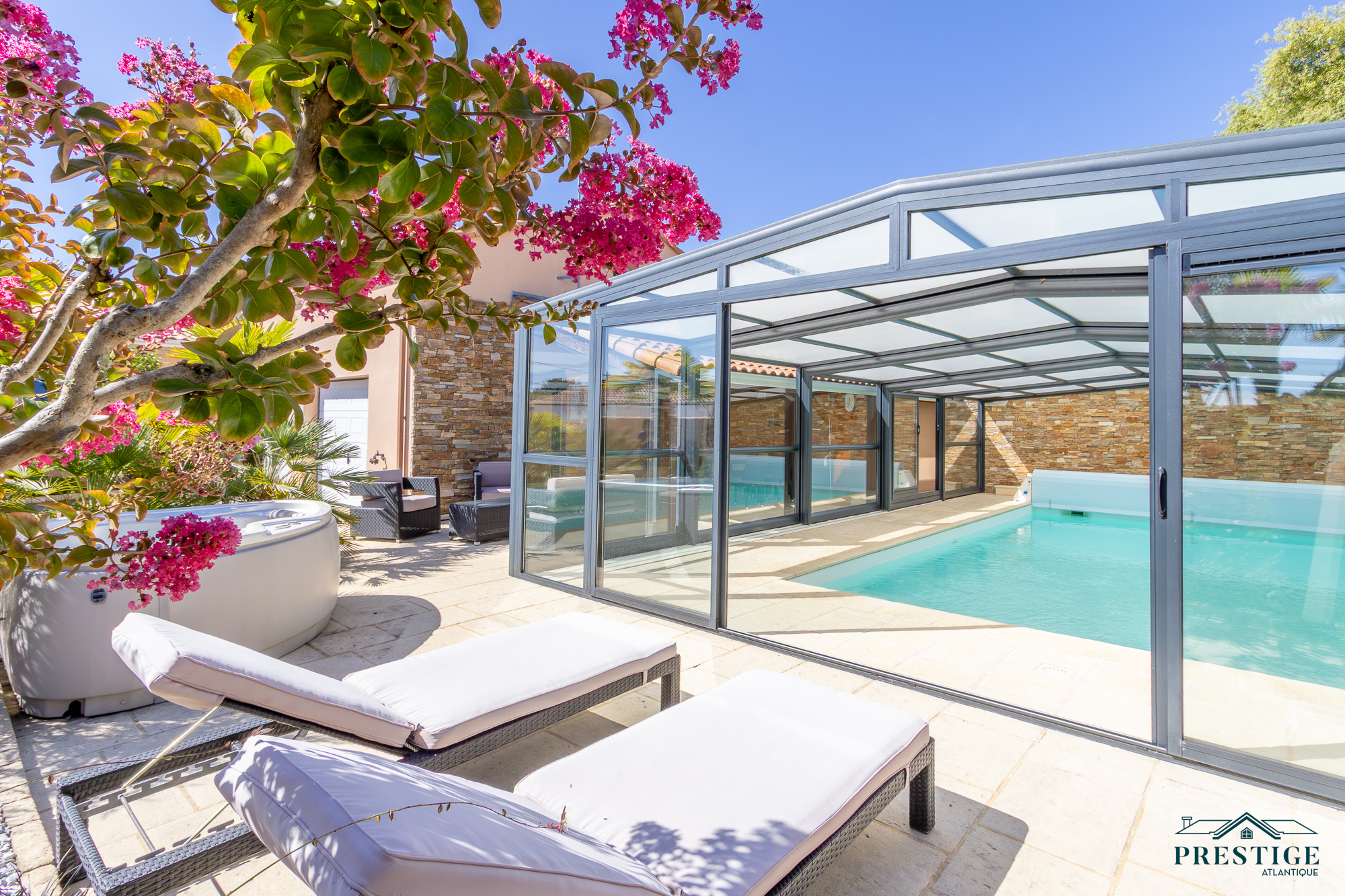 SOUS PROMESSE DE VENTE PAR PRESTIGE ATLANTIQUE. À deux pas des chemins cyclables menant au vieux port de Pornic, cette maison contemporaine de plain-pied dispose de 205m² utiles au cœur d’un environnement calme et recherché. Elle offre une pièce de vie lumineuse aux multiples baies vitrées, agrémentée d’une cuisine ouverte aménagée équipée et le tout en accès direct à une terrasse avec pergola bioclimatique venant offrir un plus à l’extérieur. Une arrière cuisine vient parfaire la distribution. L’espace nuit, pensé pour l’intimité se compose de quatre chambres dont deux suites avec salles d’eau privatives, ainsi qu'une salle de bains indépendante. Côté bien-être, le bien réserve un cadre rare : une piscine chauffée et couverte avec spa prolongée d’un vaste pool house pour profiter en toutes saisons. Édifiée sur une parcelle close et joliment paysager de 1 027 m², un double garage carrelé avec mezzanine apporte une touche finale à ce bien. Cette maison conjugue confort et prestations haut de gamme à quelques minutes seulement du centre et des plages de Pornic. “Les informations sur les risques auxquels ce bien est exposé sont disponibles sur le site Géorisques http://www.georisques.gouv.fr”. Pour plus de renseignements ou pour organiser une visite privée, contactez-nous sans plus attendre, PRESTIGE ATLANTIQUE 02.40.21.91.13. Prix de vente 650 000€, les honoraires sont à la charge du vendeur.(RCS. Saint- Nazaire 897 587 946).