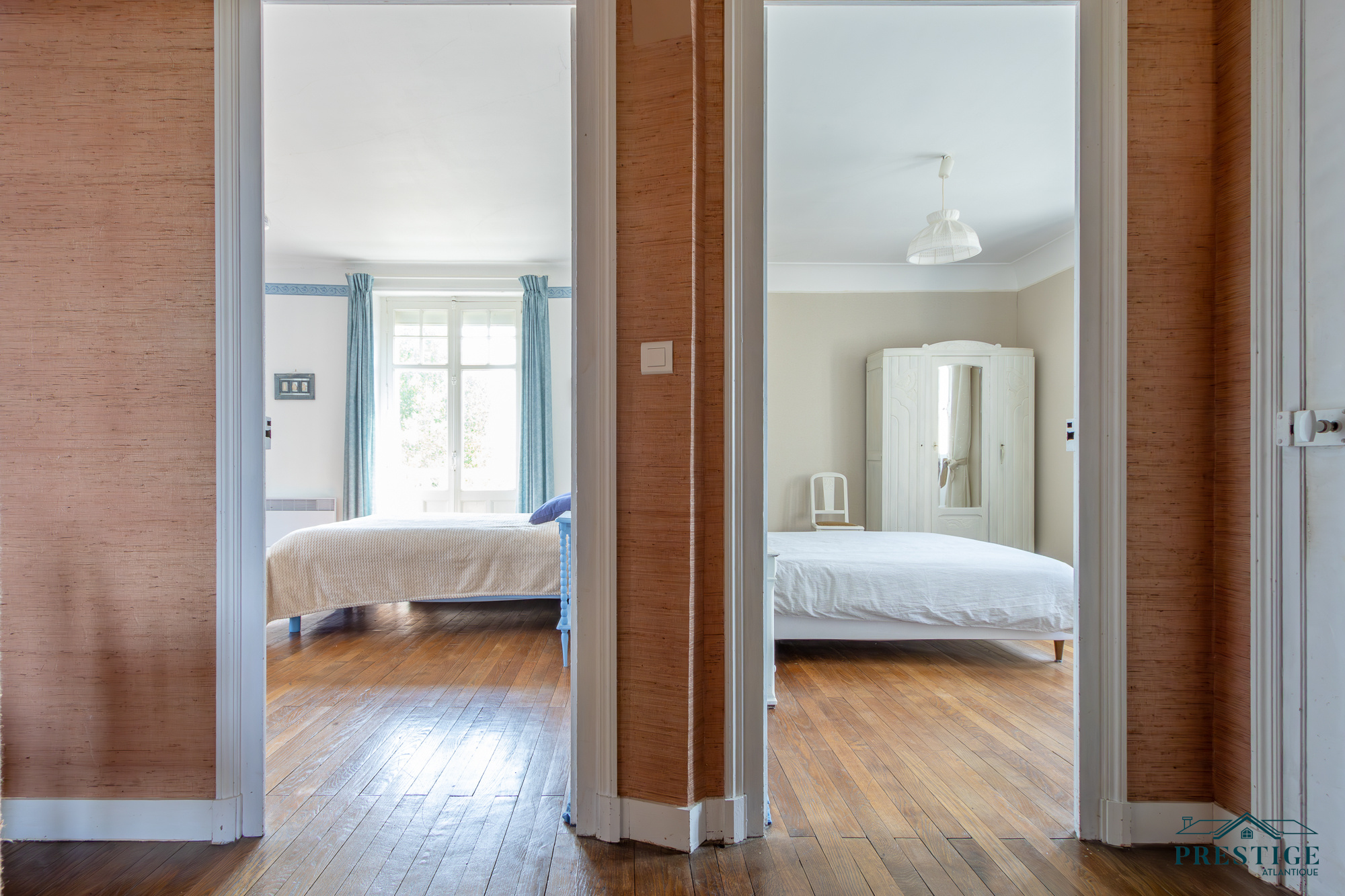 EXCLUSIVITÉ - PRESTIGE ATLANTIQUE. Dans le prisé quartier de Gourmalon, à proximité immédiate du Sentier côtier et de la plage de la Source, cette villa balnéaire d'une surface totale de 187m2 conjugue charme et confort. Dès l’entrée, située au premier niveau un séjour lumineux agrémenté d’une cheminée au style authentique prolongé d’une cuisine aménagée et équipée offre un agréable espace de vie tourné vers le jardin. Ce niveau se distingue également par la présence d’une chambre avec sa salle d’eau privative venant confirmer la vie et la praticité de cet étage principal. L’étage supérieur se compose de trois chambres sur parquet ancien et d’une salle d’eau. En rez-de-jardin, le niveau inférieur de 63m2 bénéficie d’un accès indépendant et propose de vastes espaces : garage, buanderie, cave et rangements. Non comptabilisé dans la superficie habitable, il dispose néanmoins d’une capacité utile précieuse laissant entrevoir de multiples aménagements possibles, comme un appartement indépendant, une suite amis, un atelier, ou un vaste bureau. Édifiée sur une parcelle close de 635 m² accessible par trois entrées, le jardin se distingue par un puits ancien et un verger verdoyant qui viennent sublimer l’ensemble apportant une atmosphère bucolique et rare à deux pas de l’océan. Une villa singulière alliant authenticité et fonctionnalité dans un environnement privilégié et balnéaire. “Les informations sur les risques auxquels ce bien est exposé sont disponibles sur le site Géorisques http://www.georisques.gouv.fr”. Pour plus de renseignements ou pour organiser une visite privée, contactez-nous sans plus attendre, PRESTIGE ATLANTIQUE 02.40.21.91.13. Prix de vente 899 550€, les honoraires agence sont à la charge des vendeur. (RCS. Saint- Nazaire 897 587 946).