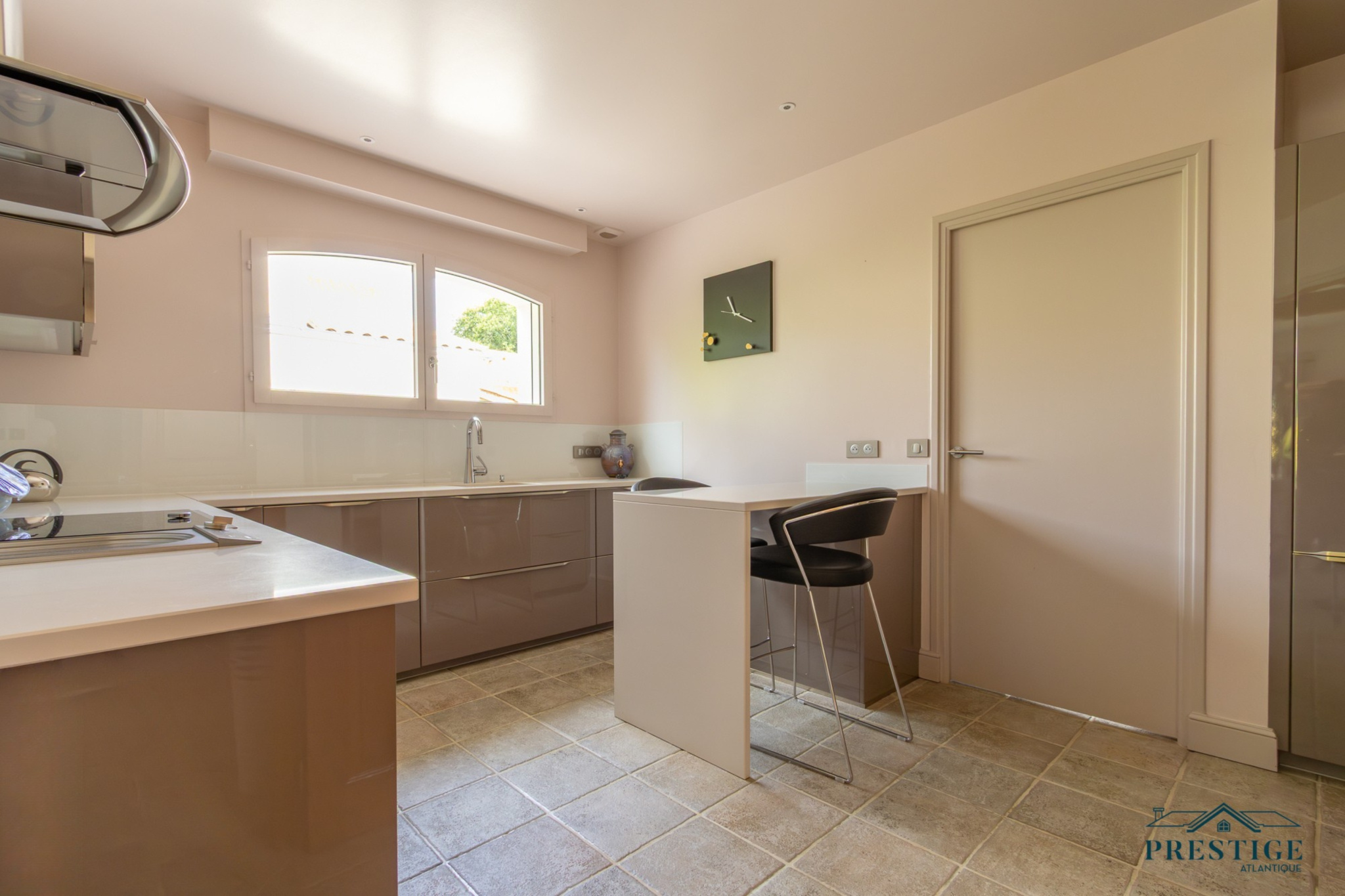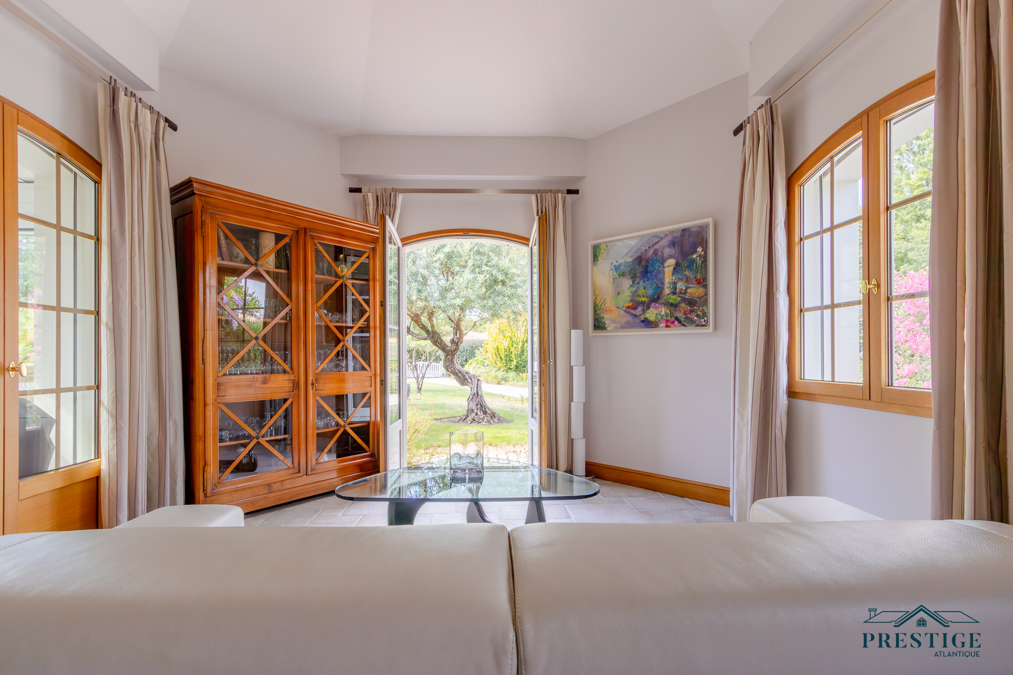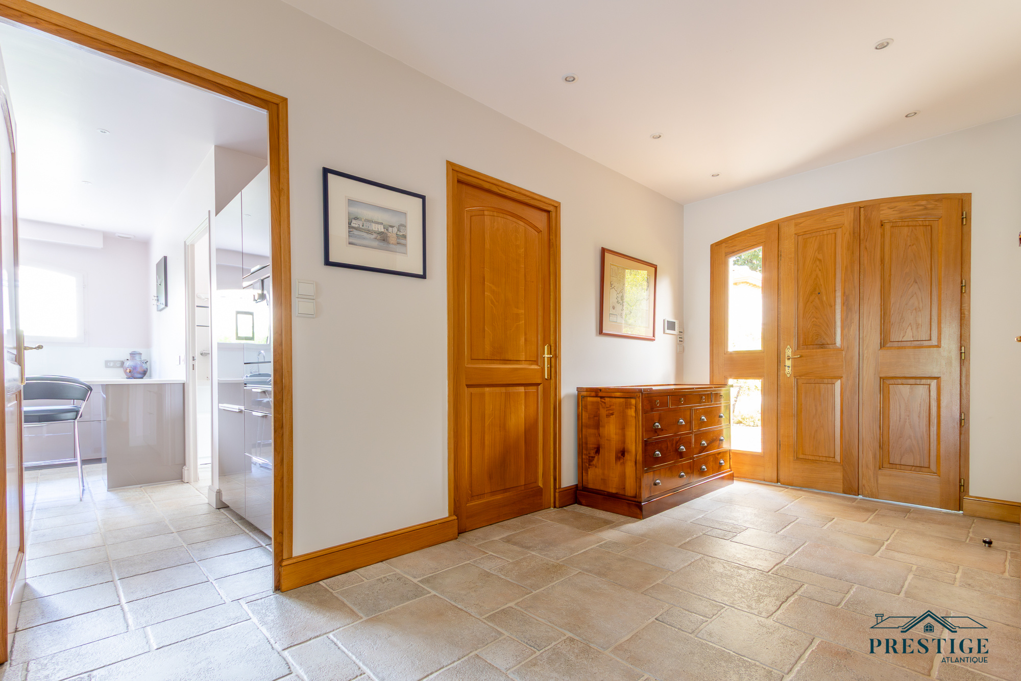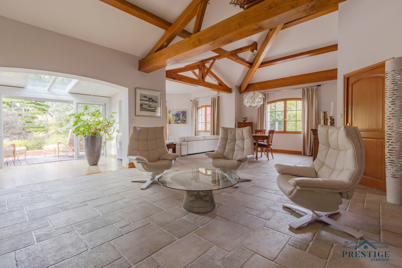 VENDU PAR PRESTIGE ATLANTIQUE. Située dans le quartier très recherché des Hauts de la Noëveillard, à proximité immédiate des plages et des commerces, cette élégante villa de plain-pied aux prestations soignées développe une surface habitable de 220 m². Un hall d’entrée avec vestibule dessert une belle pièce de vie dotée d’une grande hauteur sous plafond prolongée d’une véranda baignée de lumière, l’ensemble s’ouvrant sur une terrasse idéalement exposée avec vue sur le jardin joliment paysager. Une cuisine aménagée et équipée, accompagnée de son arrière-cuisine/buanderie vient compléter harmonieusement ce lieu de vie. L’espace nuit se compose de quatre chambres et de deux salles d’eau. Édifiée sur une parcelle close et arborée de 1 946 m², cette villa se distingue également par son sous-sol total, comprenant salle de jeux, cave, chaufferie, et un garage triple. Véritable atout supplémentaire : une chambre d’amis indépendante et un second garage apportent une touche finale à ce bien d’exception. “Les informations sur les risques auxquels ce bien est exposé sont disponibles sur le site Géorisques http://www.georisques.gouv.fr”. Pour plus de renseignements ou pour organiser une visite privée, contactez-nous sans plus attendre, PRESTIGE ATLANTIQUE 02.40.21.91.13. Prix de vente 1 199 000€ FAI dont 5 % d'honoraires agence à la charge de l'acquéreur soit un prix net vendeur de 1 141 904€ (RCS. Saint- Nazaire 897 587 946).