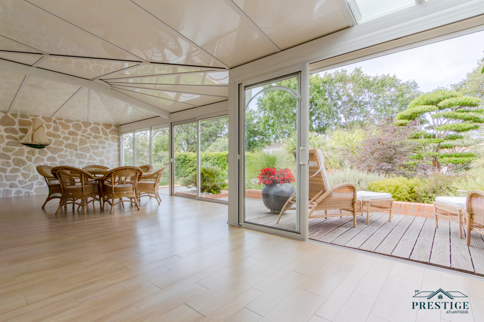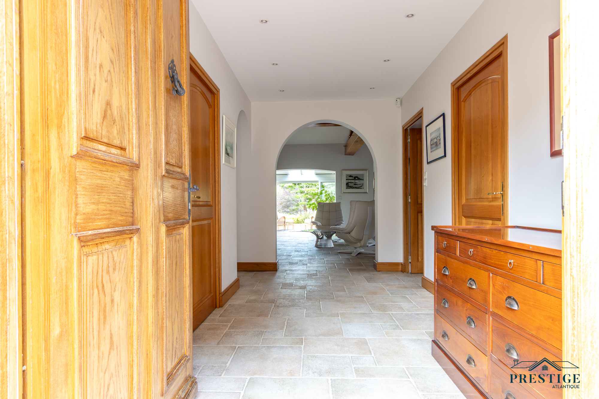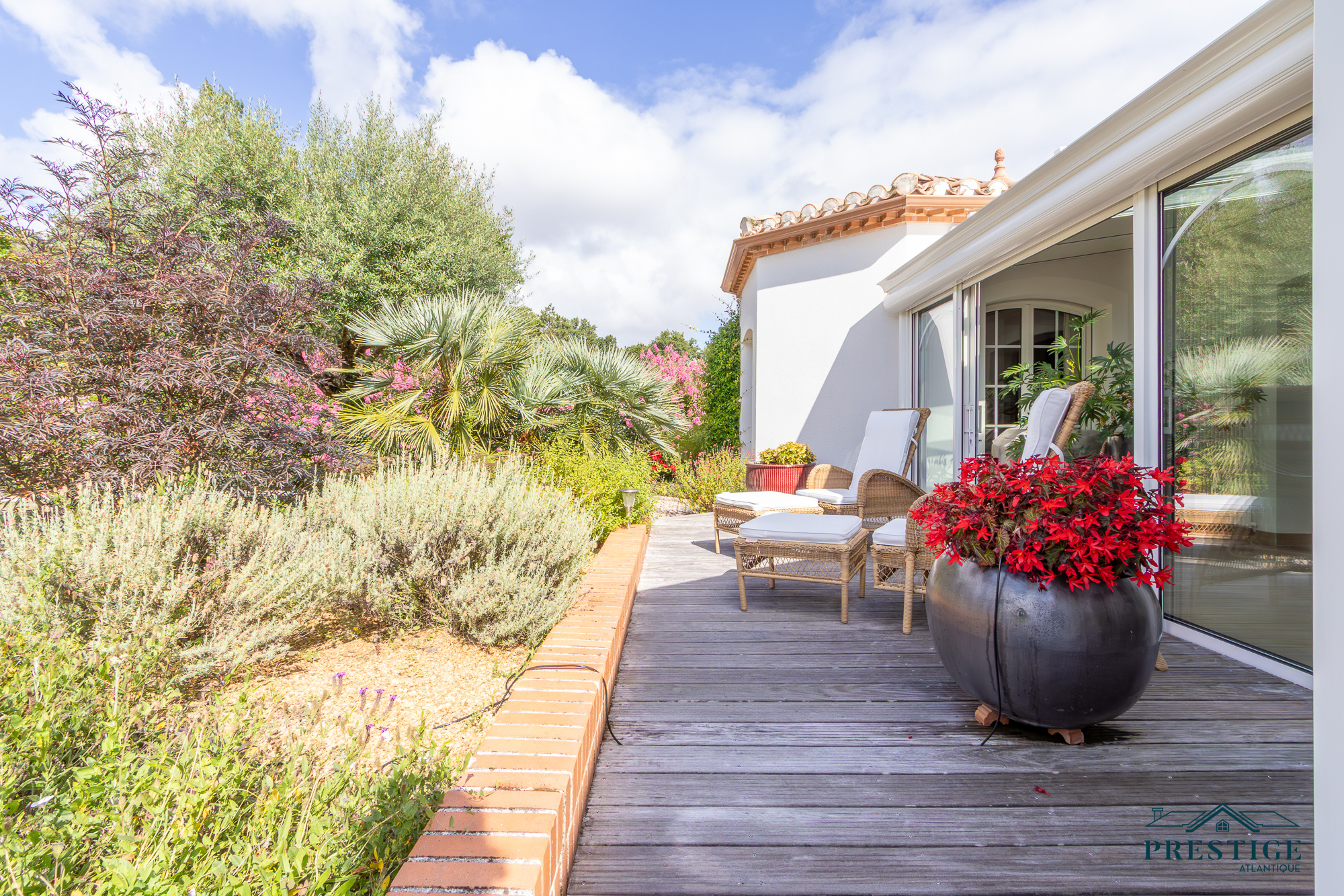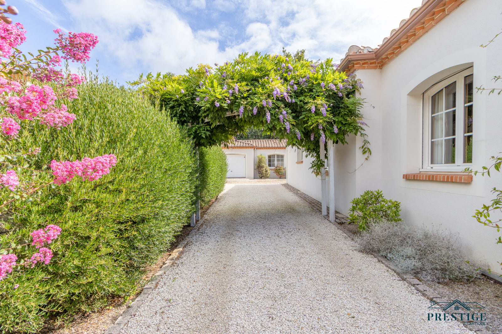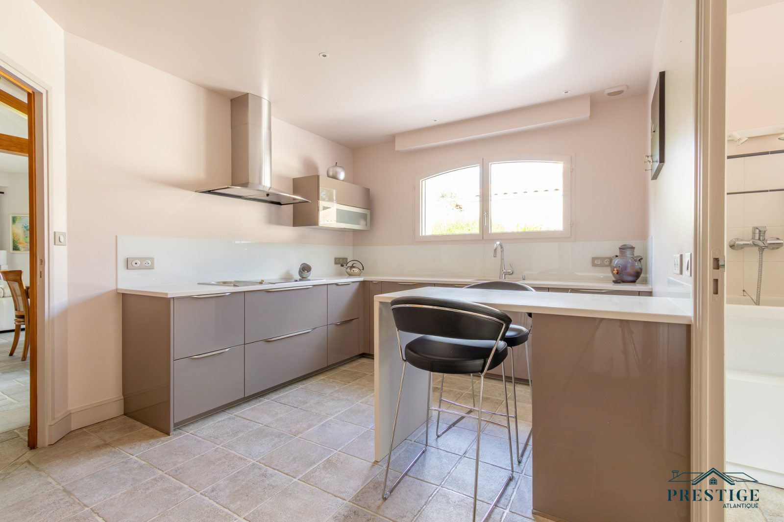 VENDU PAR PRESTIGE ATLANTIQUE. Située dans le quartier très recherché des Hauts de la Noëveillard, à proximité immédiate des plages et des commerces, cette élégante villa de plain-pied aux prestations soignées développe une surface habitable de 220 m². Un hall d’entrée avec vestibule dessert une belle pièce de vie dotée d’une grande hauteur sous plafond prolongée d’une véranda baignée de lumière, l’ensemble s’ouvrant sur une terrasse idéalement exposée avec vue sur le jardin joliment paysager. Une cuisine aménagée et équipée, accompagnée de son arrière-cuisine/buanderie vient compléter harmonieusement ce lieu de vie. L’espace nuit se compose de quatre chambres et de deux salles d’eau. Édifiée sur une parcelle close et arborée de 1 946 m², cette villa se distingue également par son sous-sol total, comprenant salle de jeux, cave, chaufferie, et un garage triple. Véritable atout supplémentaire : une chambre d’amis indépendante et un second garage apportent une touche finale à ce bien d’exception. “Les informations sur les risques auxquels ce bien est exposé sont disponibles sur le site Géorisques http://www.georisques.gouv.fr”. Pour plus de renseignements ou pour organiser une visite privée, contactez-nous sans plus attendre, PRESTIGE ATLANTIQUE 02.40.21.91.13. Prix de vente 1 199 000€ FAI dont 5 % d'honoraires agence à la charge de l'acquéreur soit un prix net vendeur de 1 141 904€ (RCS. Saint- Nazaire 897 587 946).