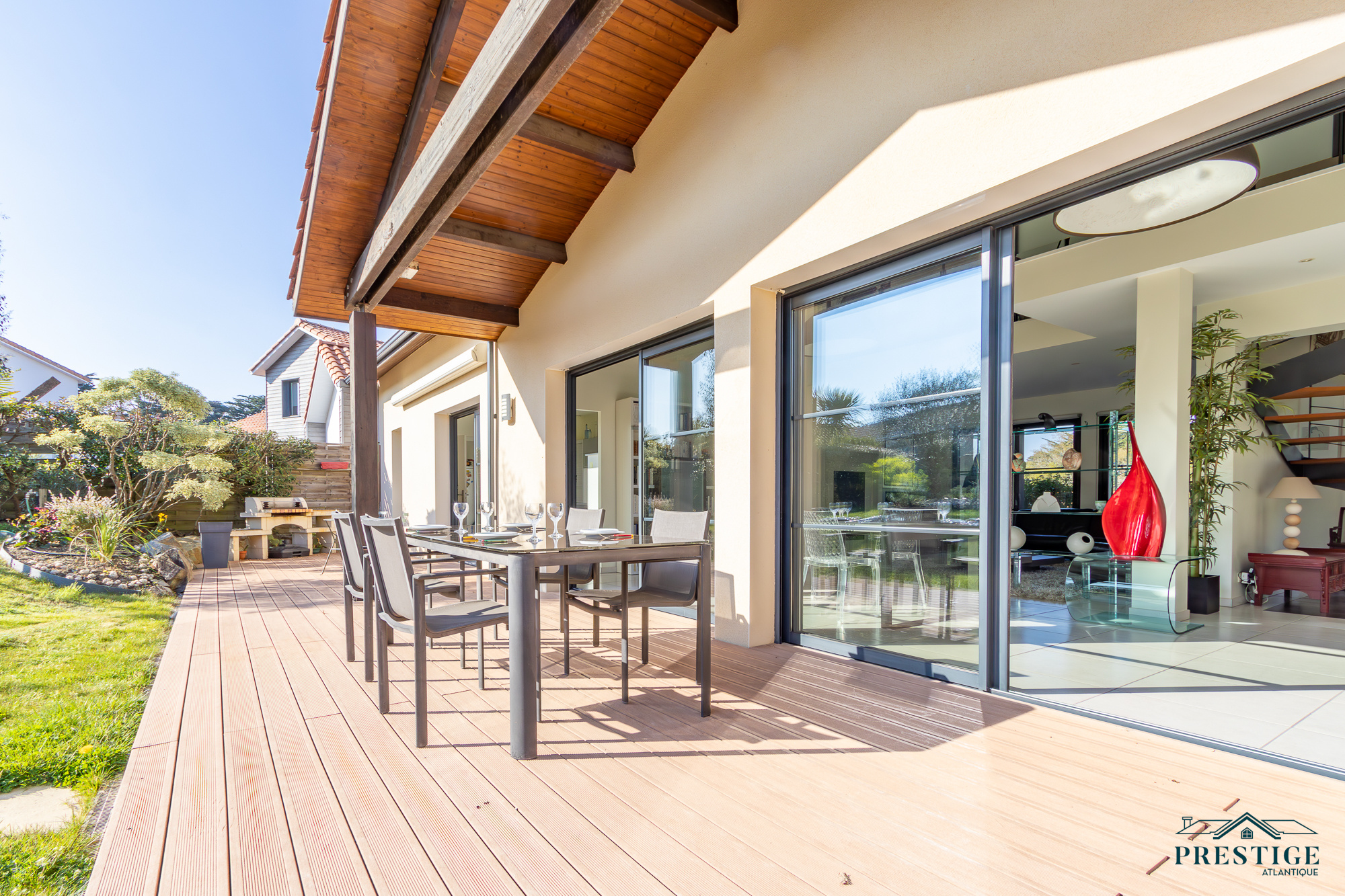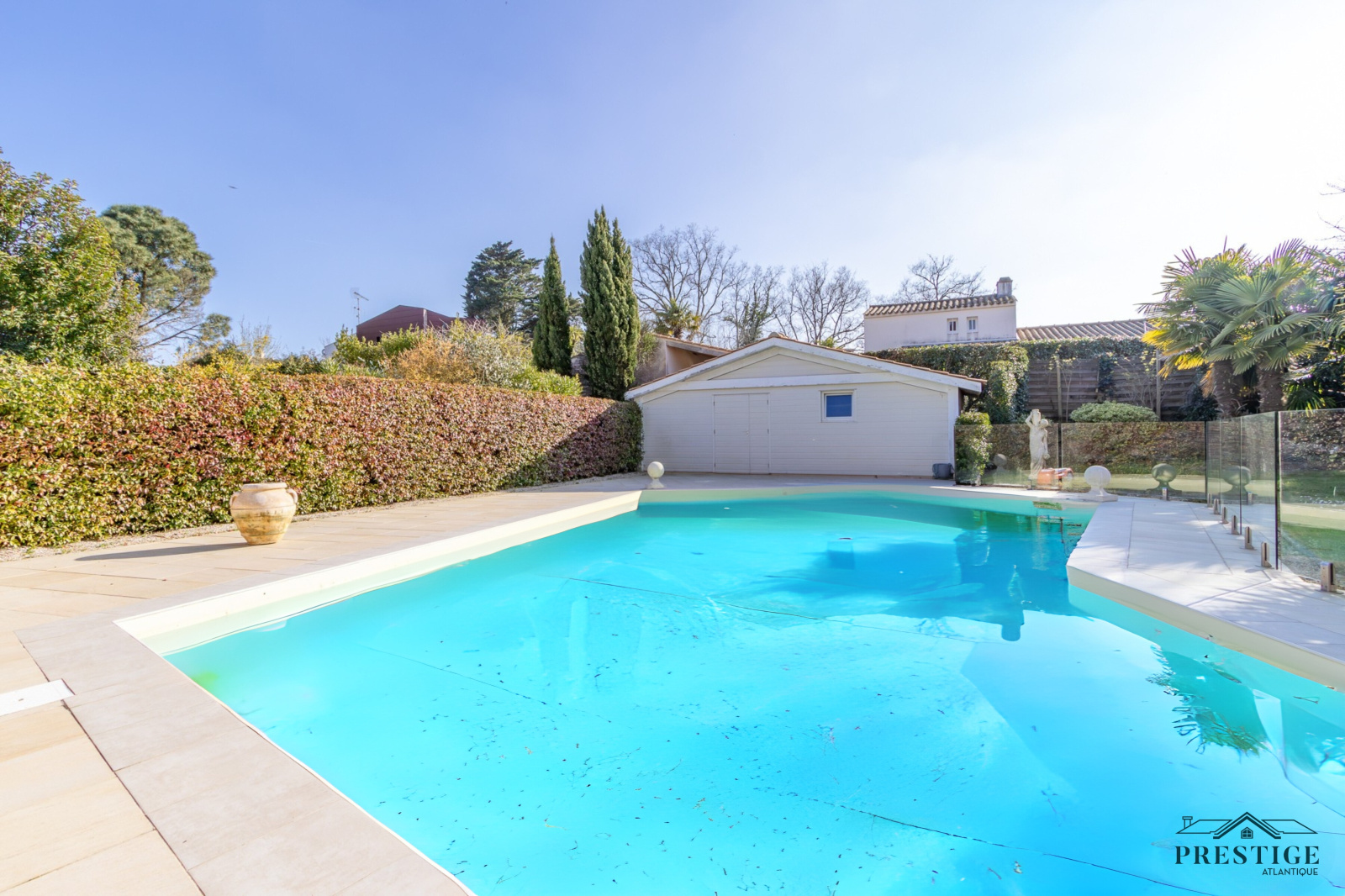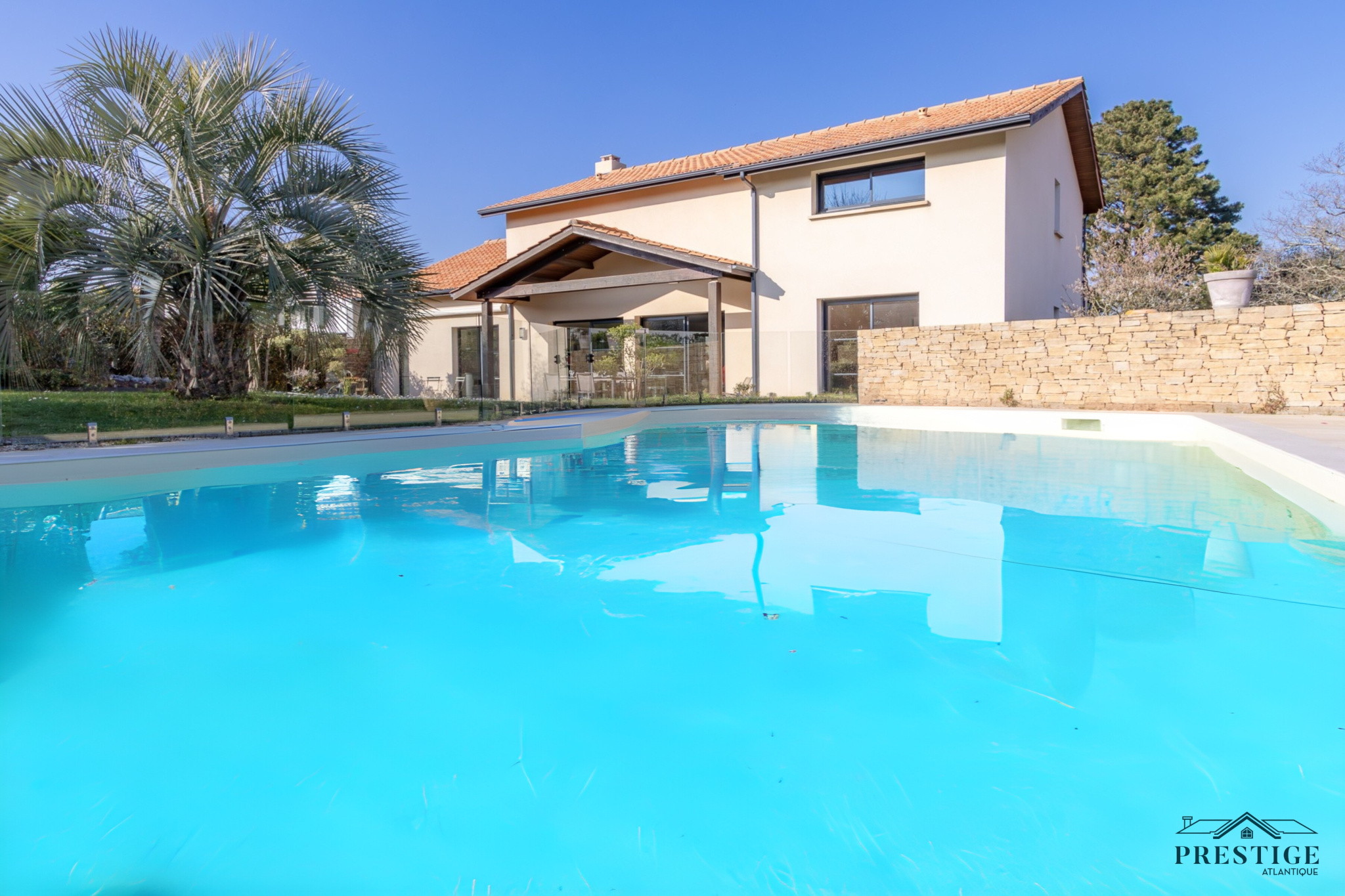 VENDU PAR PAR PRESTIGE ATLANTIQUE. Nichée dans une rue très prisée des hauts de la Noëveillard, à proximité des plages, des commerces et non loin du golf, cette villa d’exception sur deux niveaux agencée avec goût et aux prestations abouties dispose d’une superficie de 200m² habitables. Dès l’entrée, le ton est donné : une spacieuse pièce de vie baignée de lumière sublimée par une belle hauteur sous plafond prolongée d’une salle à manger et d’une cuisine aménagée équipée, l'ensemble offrant une magnifique perspective sur sa terrasse à la vue imprenable de sa piscine sécurisée et de son jardin apaisant aux essences méditerranéenne. Côté nuit, la vie de plain-pied est assurée par une suite parentale en accès direct sur l’extérieur avec salle d’eau/dressing, ainsi qu’une seconde chambre avec placard. Au niveau supérieur, un grand palier lumineux avec son espace bureau vient distribuer deux chambres avec placard et une salle d’eau communicante. Edifiée sur une parcelle close de 1067m2 joliment paysager et arboré, un spacieux pool house et un double garage donnent un point final à ce bien. Unique et rare, elle offre un cadre de vie idyllique aux portes de l’Océan. "Les informations sur les risques auxquels ce bien est exposé sont disponibles sur le site Géorisque http://www.georisques.gouv.fr”. Pour plus de renseignements ou pour organiser une visite privée, contactez-nous sans plus attendre, PRESTIGE ATLANTIQUE 02.40.21.91.13. Prix de vente 1 260 000€ FAI dont 5 % d'honoraires agence à la charge de l'acquéreur soit un prix net vendeur de 1 200 000€ (RCS. Saint- Nazaire 897 587 946).