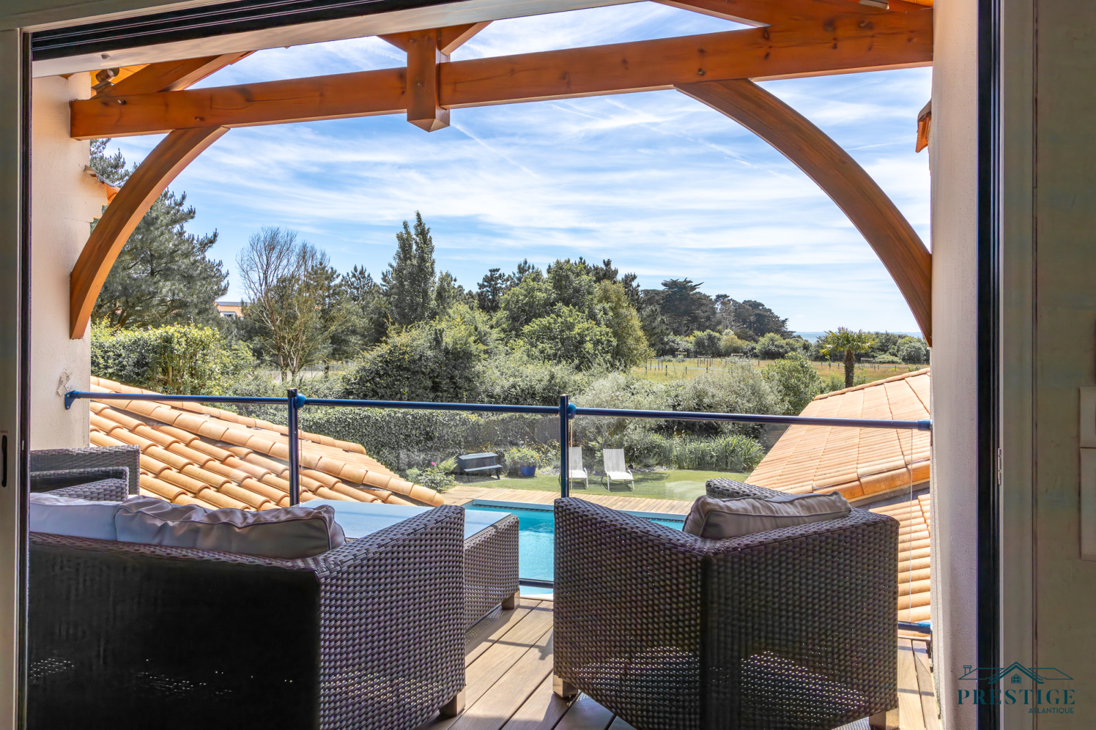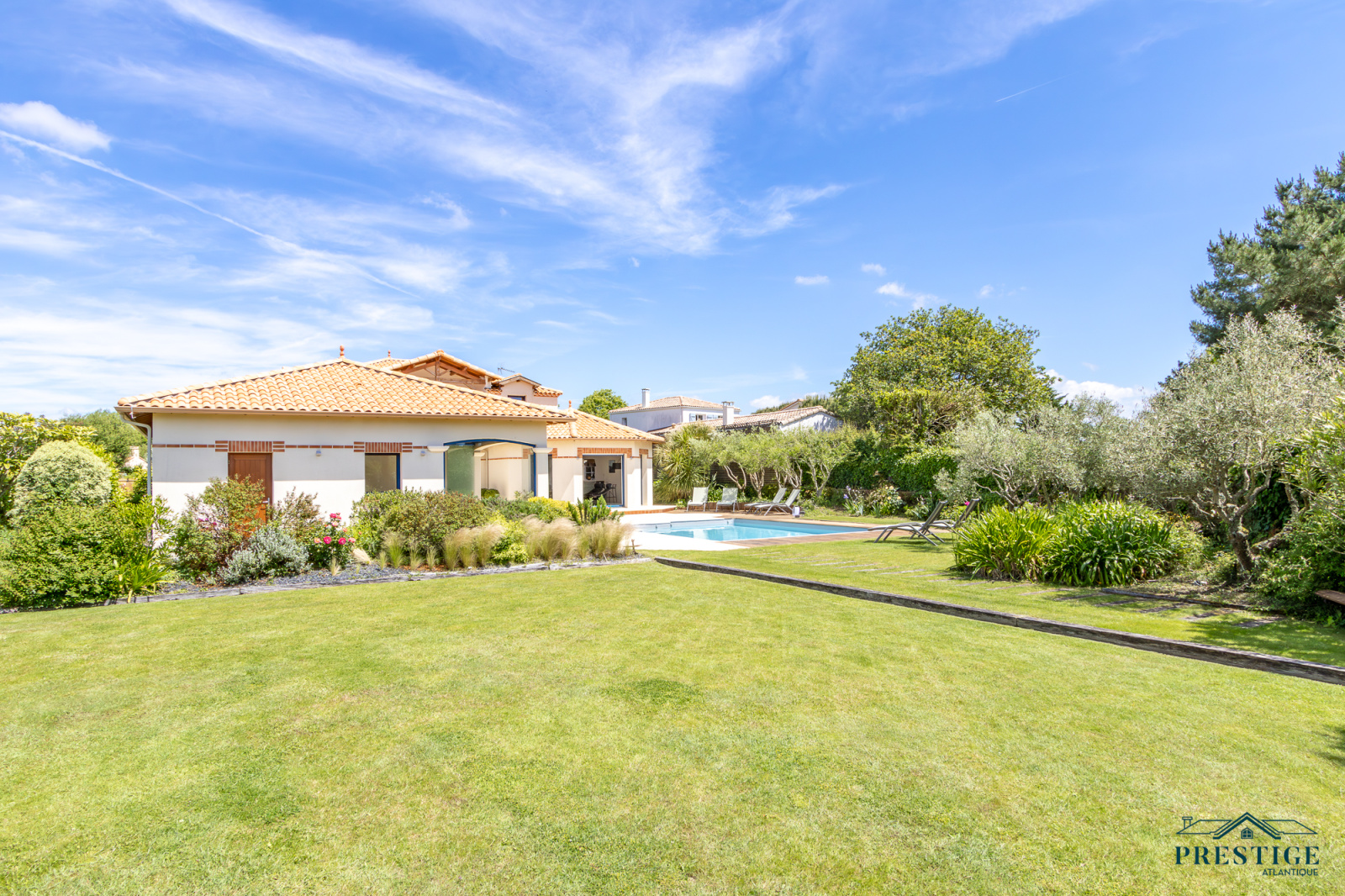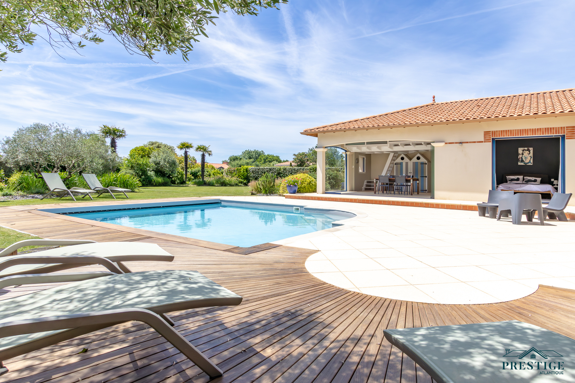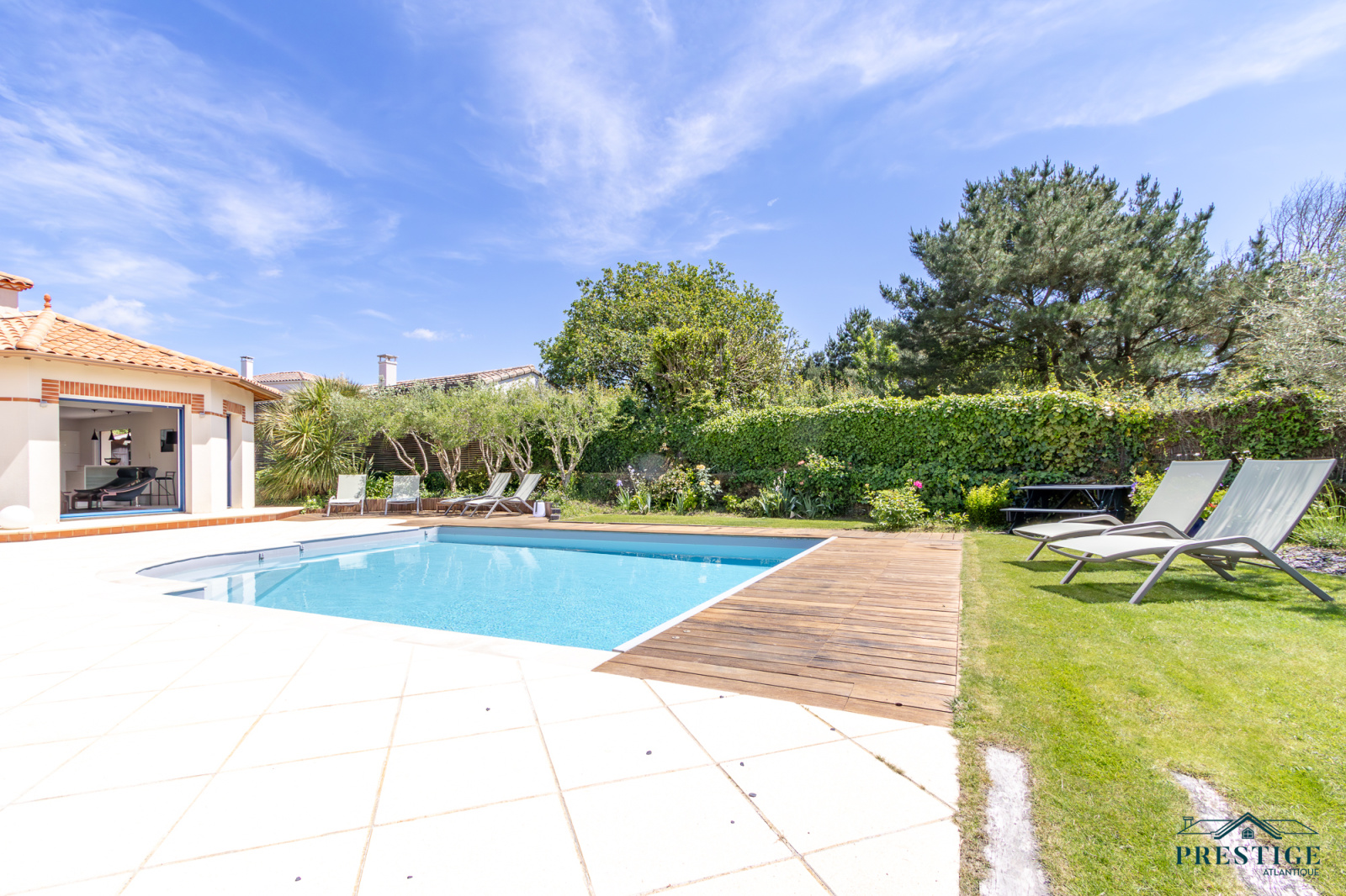VENDU PAR PRESTIGE ATLANTIQUE. Située dans une résidence privée de standing à l’abri des regards et en parfaite quiétude, cette somptueuse villa de style Pornicais développe 240 m² habitables sur deux niveaux au sein d’un environnement privilégié. Dès le hall d’entrée, le ton est donné : une élégante triple réception (salon, séjour, cuisine) baignée de lumière s’ouvre généreusement sur un jardin paysager, véritable tableau vivant avec vue imprenable sur une piscine chauffée bordée de terrasses en bois biseauté issues du mythique Queen Mary 2. Dans le prolongement un vaste pool house avec mezzanine vient parfaire l’art de vivre en extérieur venant offrir un espace supplémentaire idéal pour recevoir. La villa offre également le confort d’une vie de plain-pied avec un espace nuit indépendant comprenant deux chambres et une salle de bains contemporaine équipée d’une douche à l’italienne. À l’étage sur parquet, le raffinement se poursuit avec une magnifique suite parentale : chambre avec dressing, salle de bains, et accès direct à une terrasse privative en bois avec vue imprenable sur l’océan. Un bureau et une chambre viennent compléter la distribution de ce niveau. Édifiée sur une parcelle close et joliment paysager de 1 210 m², un double garage, une cave à vin climatisée et une buanderie donnent une touche finale à cette Villa de Prestige. Cette villa est une invitation unique à vivre la mer au quotidien dans un cadre aussi préservé que prestigieux.“Les informations sur les risques auxquels ce bien est exposé sont disponibles sur le site Géorisques http://www.georisques.gouv.fr”. Pour plus de renseignements ou pour organiser une visite privée, contactez-nous sans plus attendre, PRESTIGE ATLANTIQUE 02.40.21.91.13. Prix de vente 1 995 000€ FAI dont 5 % d'honoraires agence à la charge de l'acquéreur soit un prix net vendeur de 1 900 000€ (RCS. Saint- Nazaire 897 587 946).