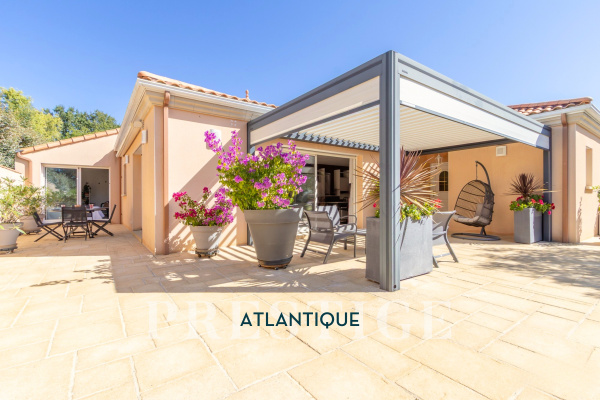 SOUS PROMESSE DE VENTE PAR PRESTIGE ATLANTIQUE. Dans un environnement privilégié et verdoyant au fond de son impasse, cette maison contemporaine de 2012 bénéficiant de beaux volumes et de prestations abouties dispose d'une superficie habitable de 190 m² sur deux niveaux. Elle propose au rez-de-jardin une pièce de vie en double réception agrémentée d'une cuisine aménagée et équipée, le tout donnant sur une terrasse sublimée de sa piscine chauffée et couverte à l’exposition solaire idéale. Un espace couvert complète la vie d’extérieur. L’espace nuit se compose de deux chambres et d’une salle d’eau dont une attention toute particulière pour l’une d’entre elles faisant office de master room (salle d’eau / dressing / salle de sport). À l'étage un palier dessert deux chambres avec placards, une salle d’eau ainsi qu’une suite avec sa propre salle d’eau. Edifiée sur une parcelle close joliment arborée de 1 497 m², deux garages donnent une touche finale à ce bien d’exception. Une maison récente disposant d'une magnifique vie d’extérieur dans un calme absolu. “Les informations sur les risques auxquels ce bien est exposé sont disponibles sur le site Géorisques http://www.georisques.gouv.fr ”. Pour plus de renseignements ou pour organiser une visite privée, contactez-nous sans plus attendre, PRESTIGE ATLANTIQUE 02.40.21.91.13. Prix de vente 699 825€ FAI dont 5 % d'honoraires agence à la charge de l'acquéreur soit un prix net vendeur de 666 500€ (RCS. Saint- Nazaire 897 587 946).