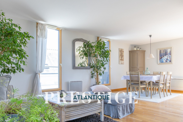 EXCLUSIVITÉ - PRESTIGE ATLANTIQUE. PENTHOUSE. Au sommet d ’ un immeuble de grand standing sur l’Île de Nantes, cet appartement unique de 158 m² habitables, accessible par ascenseur occupe exclusivement le dernier étage. Il est sublimé par deux terrasses plein ciel, totalisant 103 m² exposés plein sud, véritables prolongements à ciel ouvert de l ’ espace de vie. Une maison perchée dans les nuages, aux volumes généreux et aux prestations haut de gamme. Une pièce de vie lumineuse avec cuisine premium prolongée par une terrasse filante et un toit-terrasse paysager, jardin suspendu avec vue à 360° sur Nantes. Espace nuit raffiné : une suite parentale avec vue sur les contructions emblématiques de la ville, dressing et salle d’eau privative, 3 chambres supplémentaires, une seconde salle d’eau et de nombreux rangements. Un double garage sécurisé donne une touche finale à ce bien de Prestige. À deux pas du centre-ville et de l’aéroport, une adresse exceptionnelle sur l’Île de Nantes, un appartement rare sur le marché entre ville et ciel pour un art de vivre incomparable. Charges de copropriété 3507€ annuelles. Aucune procédure en cours. 20 lots. “Les informations sur les risques auxquels ce bien est exposé sont disponibles sur le site Géorisques http://www.georisques.gouv.fr ”. Pour plus de renseignements ou pour organiser une visite privée, contactez-nous sans plus attendre, PRESTIGE ATLANTIQUE 02.40.21.91.13. Prix de vente 1 494 150€ FAI dont 5 % d'honoraires agence à la charge de l'acquéreur soit un prix net vendeur de 1 423 000€ (RCS. Saint- Nazaire 897 587 946).